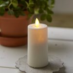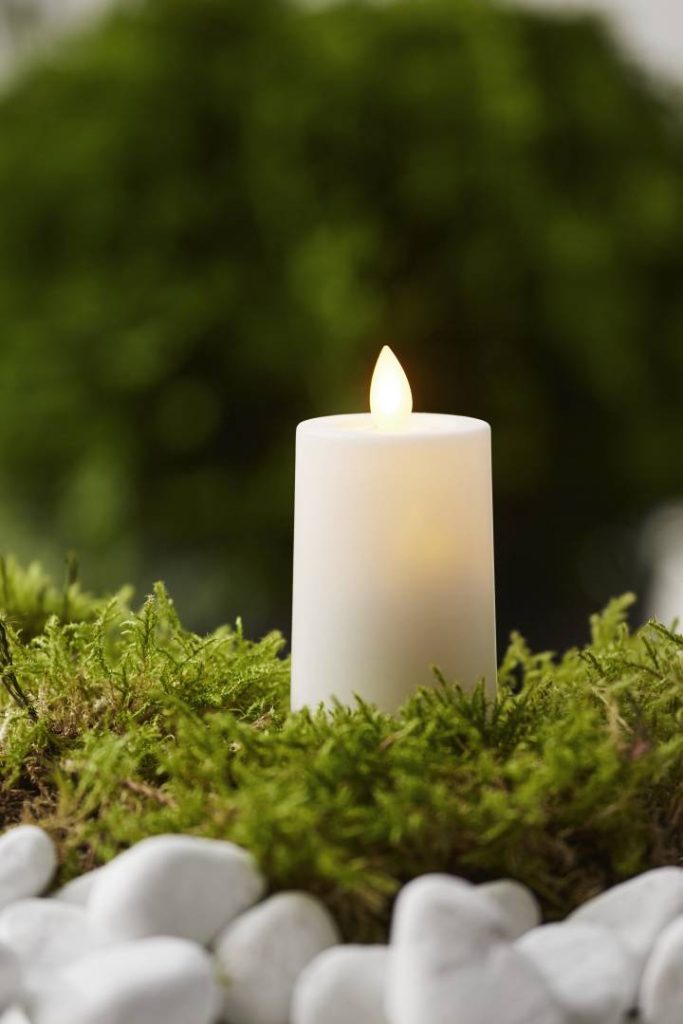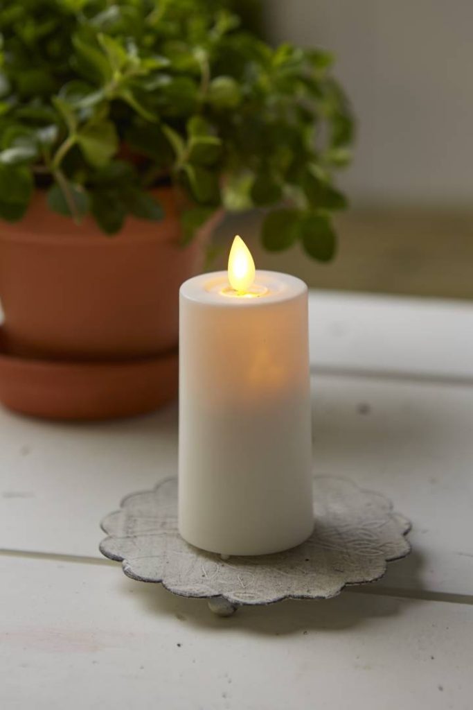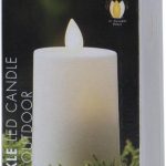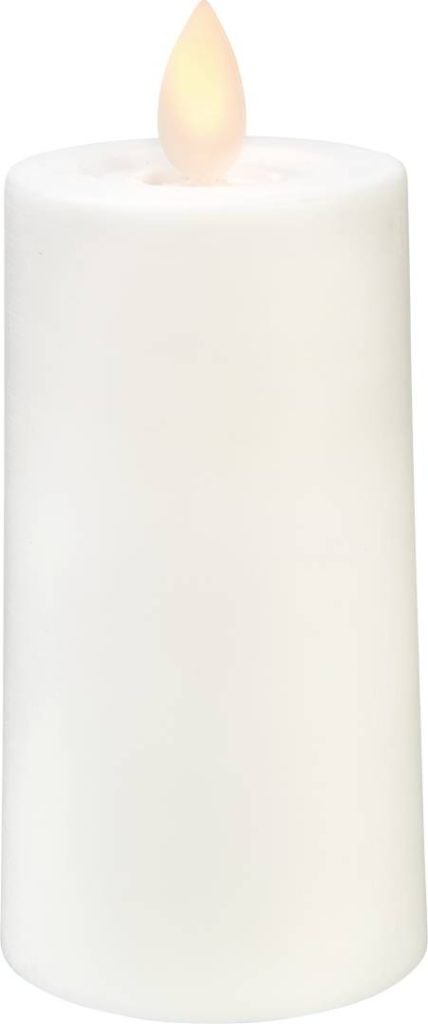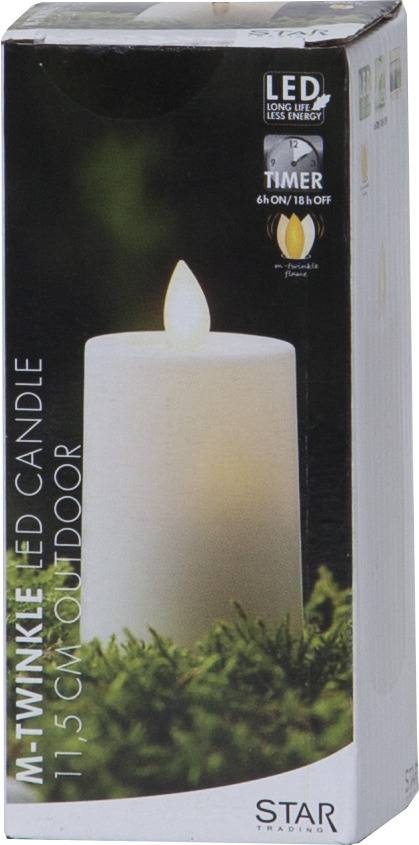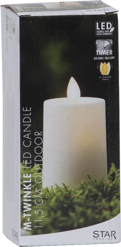 Ulko- ja sisäkäyttöön sopiva muovista valmistettu LED-kynttilä, jossa on lämpimän keltainen lepattava Twinkle-liekki.