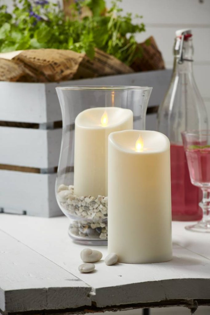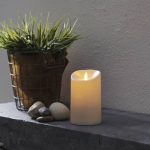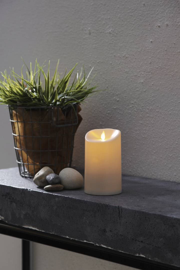 Ulko- ja sisäkäyttöön sopiva muovista valmistettu LED-kynttilä, jossa on lämpimän keltainen lepattava Twinkle-liekki.