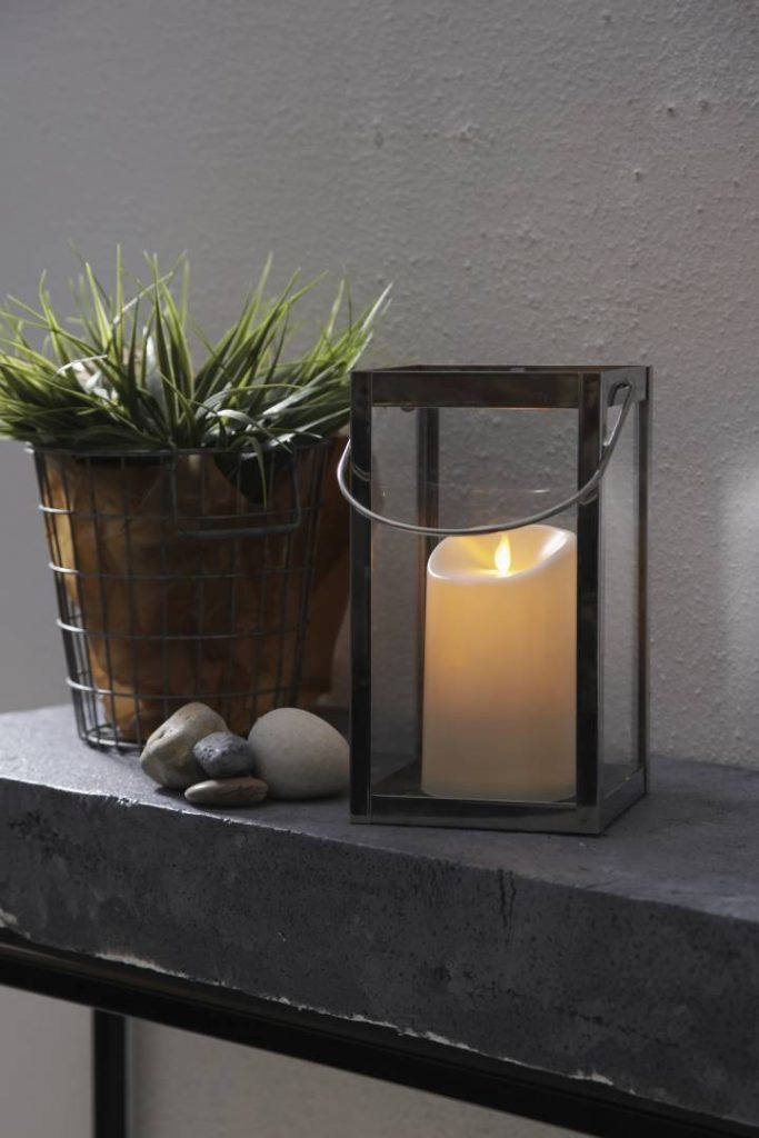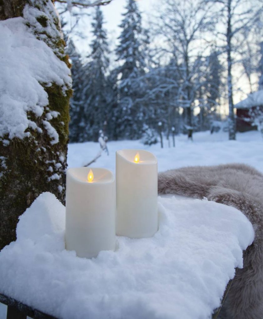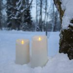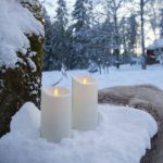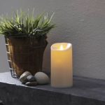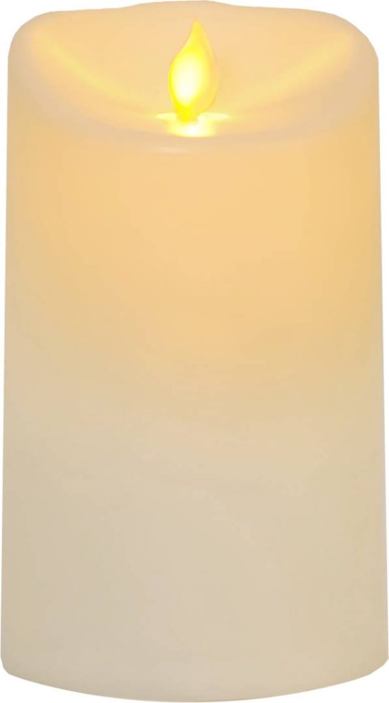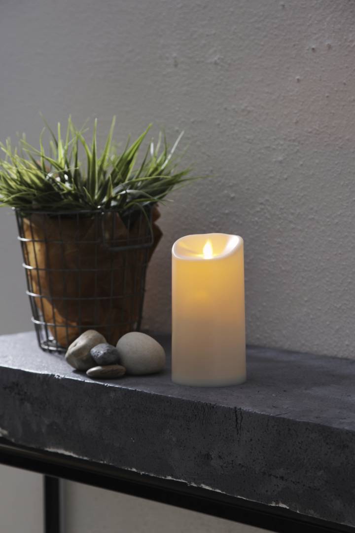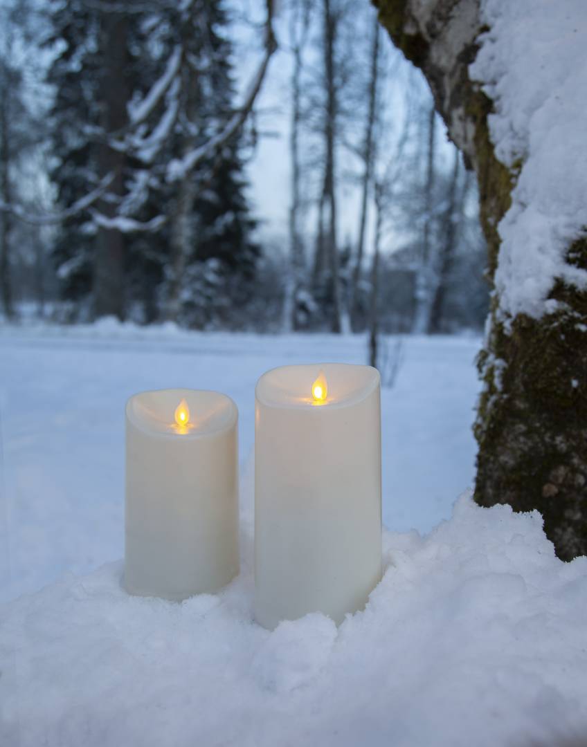 Ulko- ja sisäkäyttöön sopiva muovista valmistettu LED-kynttilä, jossa on lämpimän keltainen lepattava Twinkle-liekki.