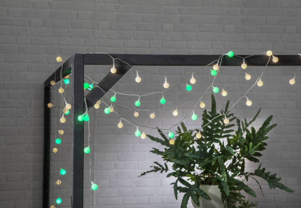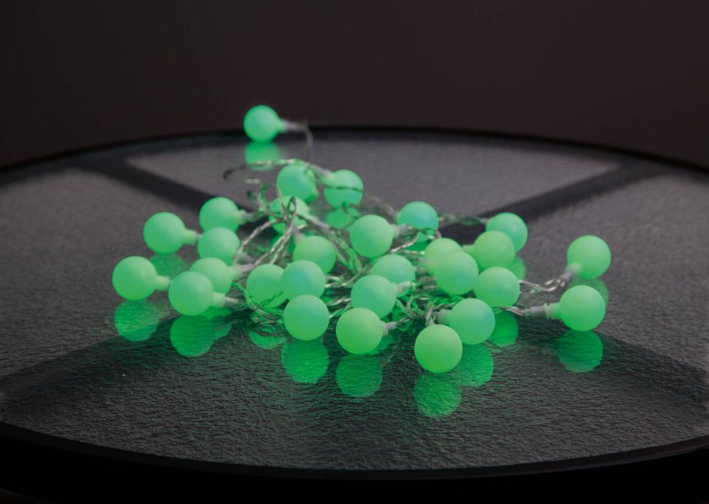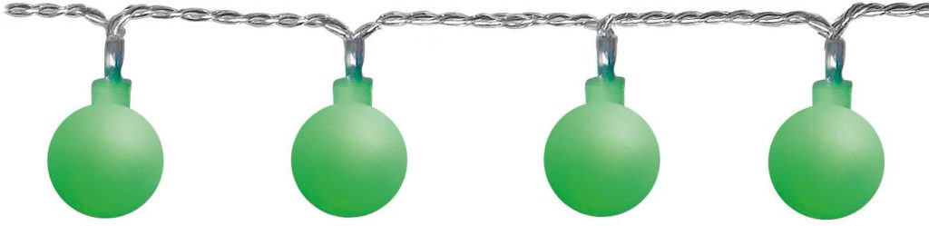 Ulkokäyttöön sopiva valosarja, jossa on läpinäkyvässä kaapelissa 50 pientä opaalivalkoista kuulaa vihreillä LED-valoilla. Sopii esimerkiksi juhlateltan tai terassin koristeluun.