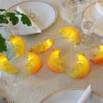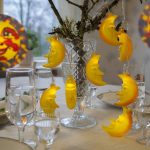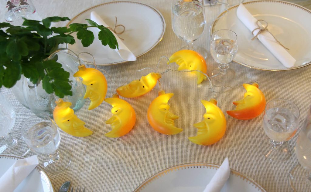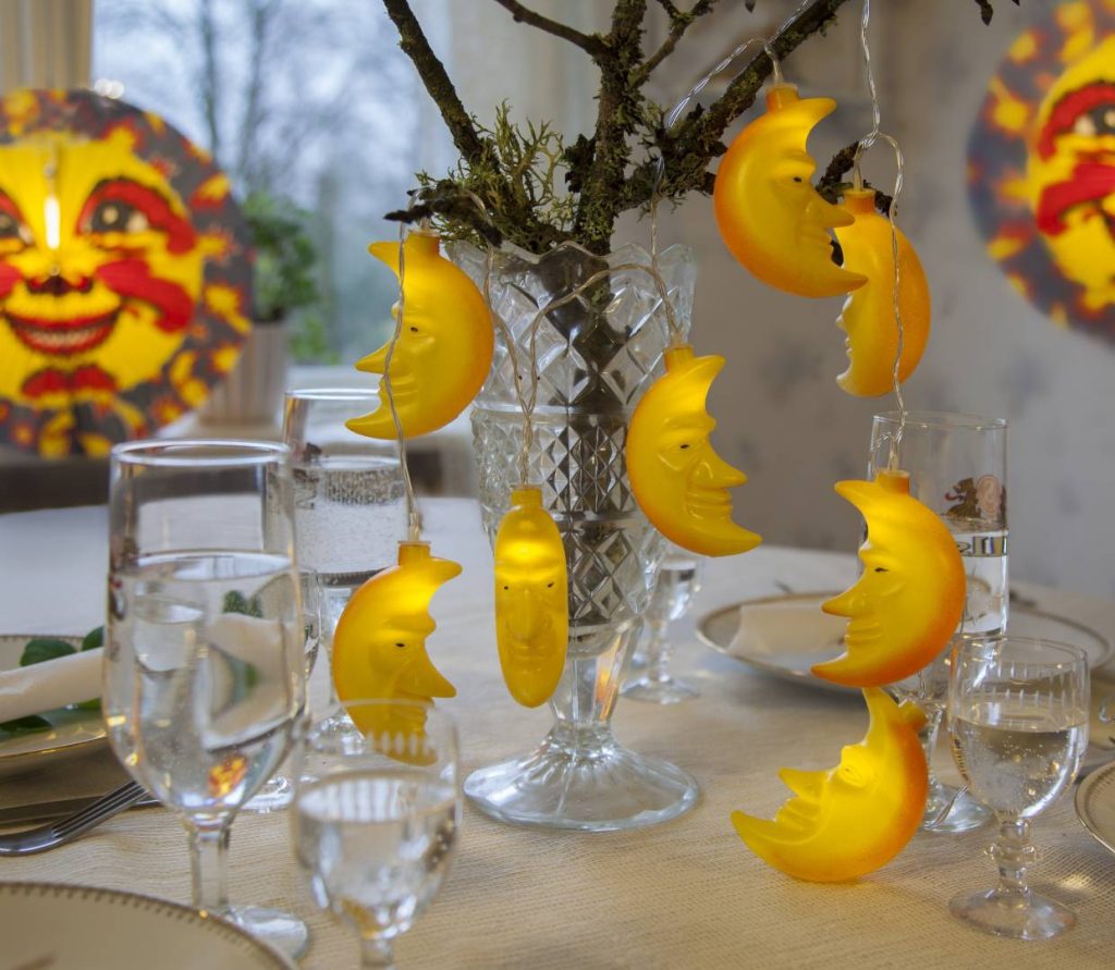 105 cm pitkä paristokäyttöinen valosarja, jossa on 8 lämpimän valkoista LED-valoa ja kuukoristeet.