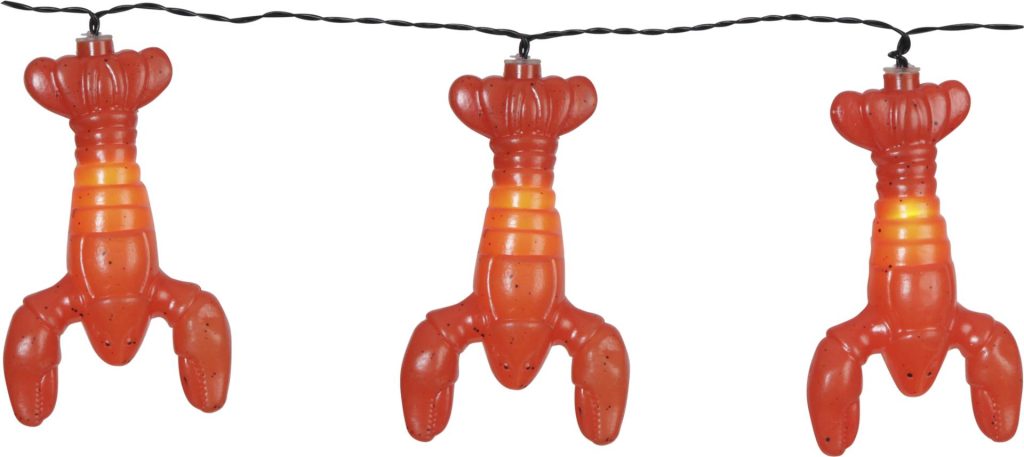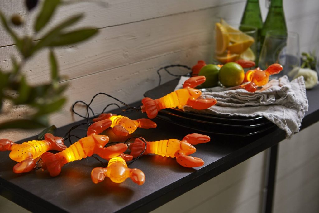 Paristokäyttöinen sekä sisä- että ulkokäyttöön sopiva valosarja, jossa on koristeena 8 rapua lämpimän valkoisilla LED-valoilla. Musta kaapeli.