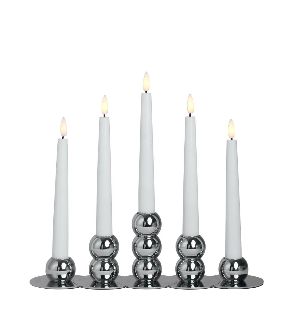 Lilli-kynttilänjalkasetti sisältää viisi metallista kynttilänjalkaa, 9 pyöreää irtoholkkia sekä 20 cm korkeat turvalliset ja lapsiystävälliset LED-vahakynttilät kaukosäätimellä.