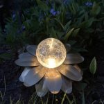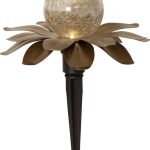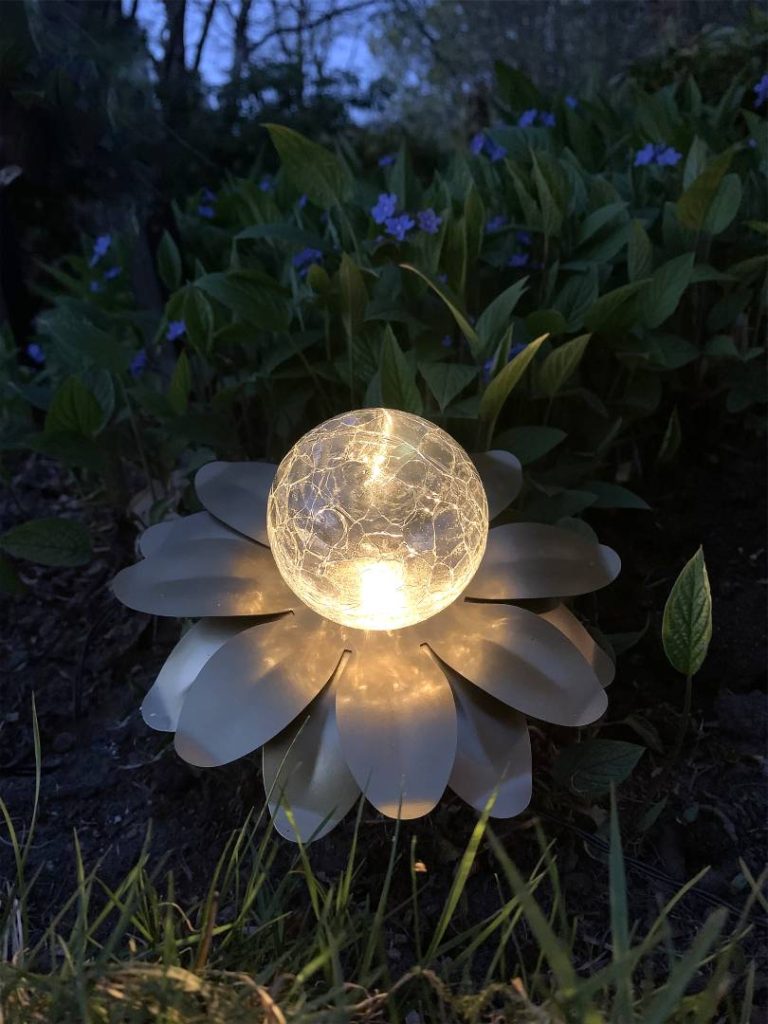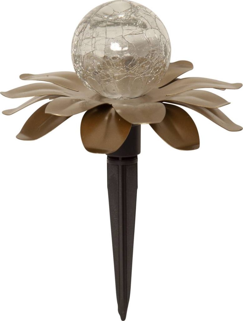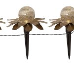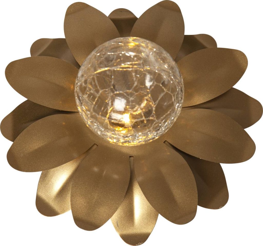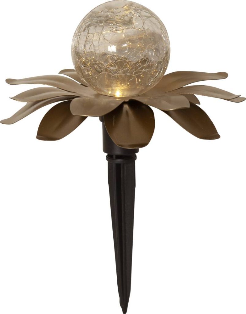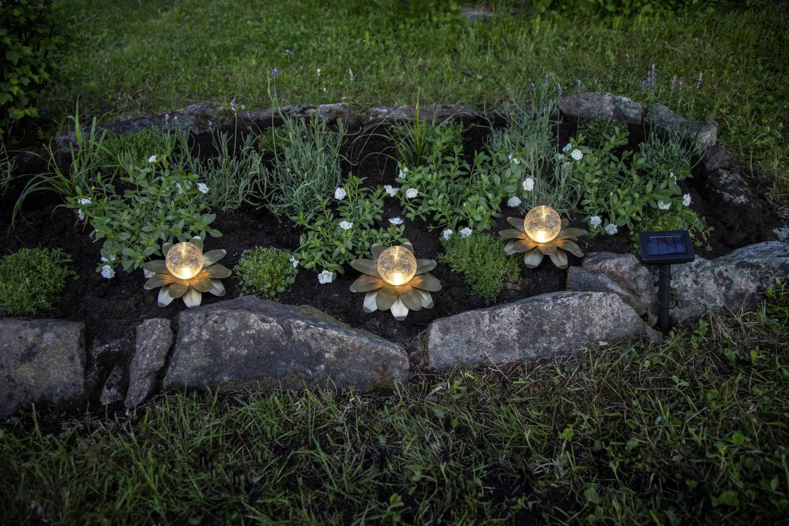 Aurinkokennolla toimiva kaunis kolmeosainen LED-koristevalaisin. Koristeissa on kullanväriset metalliset lehdet, joiden keskellä kirkkaat lasipallot. Lasipalloissa loistaa lämmin valkoinen LED-valo.
