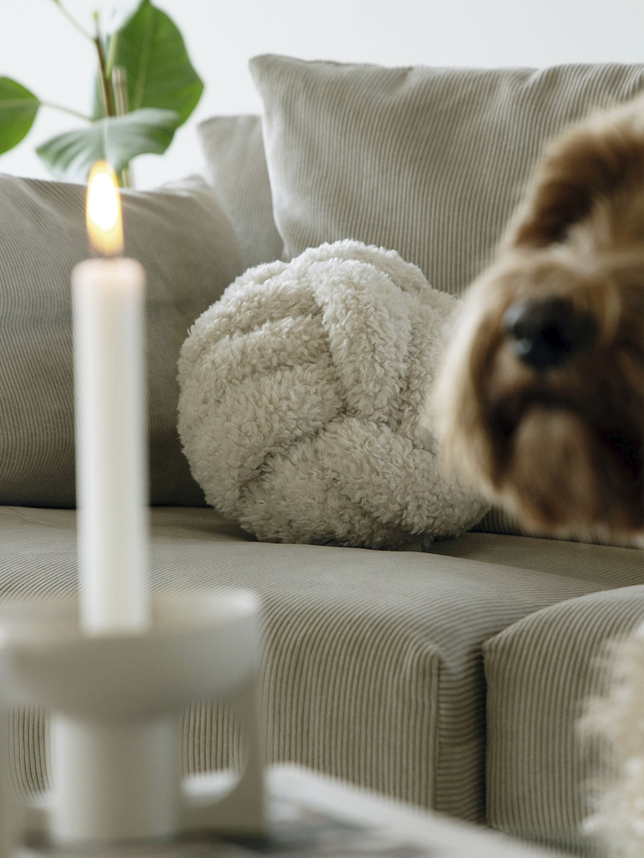 Pyöreä koristetyyny pehmeää keinoturkista. Muotonsa ansiosta tyyny on helppo sijoittaa minne tahansa. Täyte antaa hyvän tuen sohvalla tai nojatuolissa.