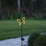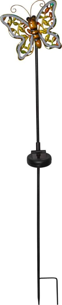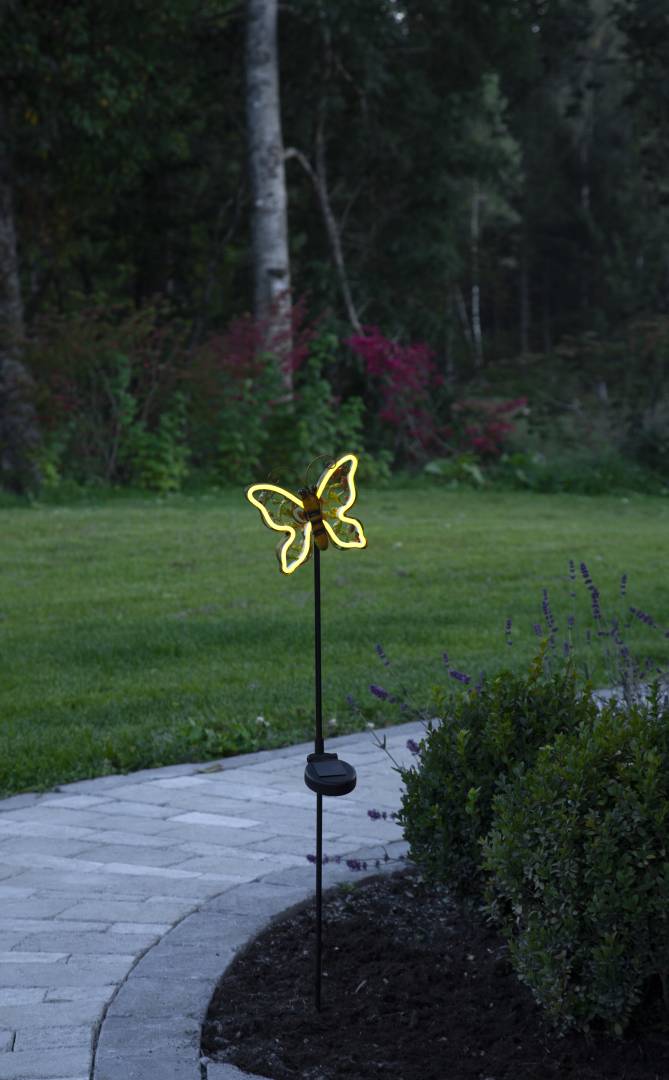 Aurinkokennolla toimiva koristevalaisin, joka on helppo asettaa esimerkiksi kukkaruukkuun tai istutusten lomaan. Perhonen on pronssin väristä metallia, ja hämärän tullen siihen syttyy neonkeltainen valo.