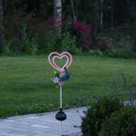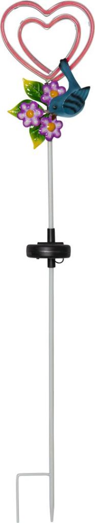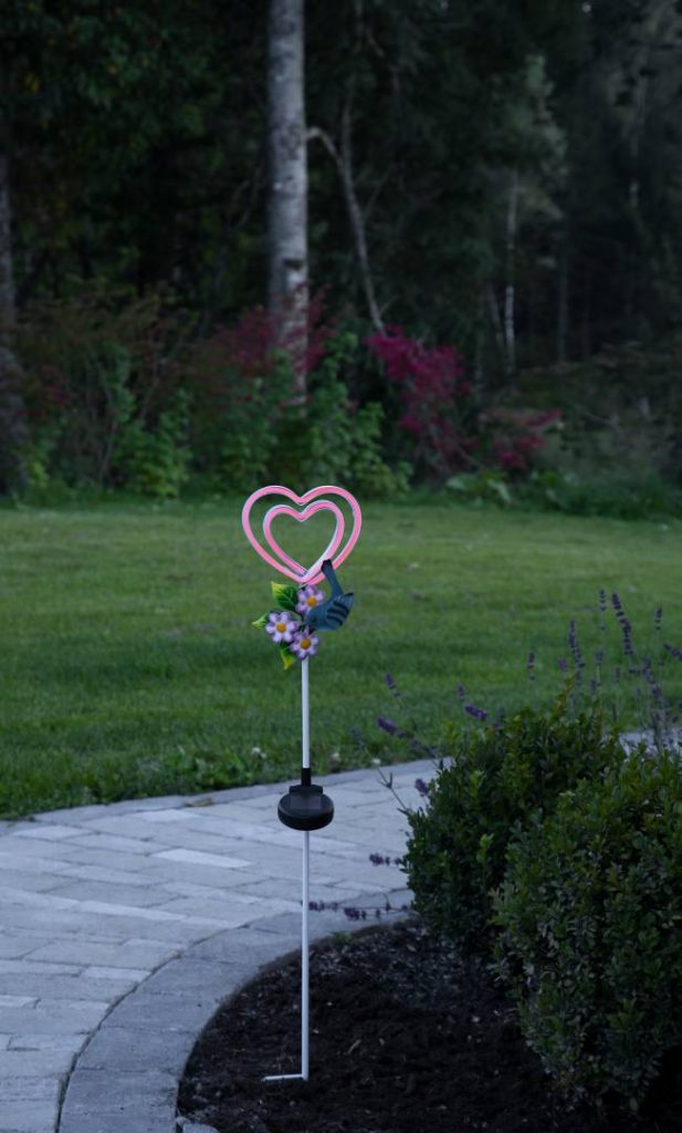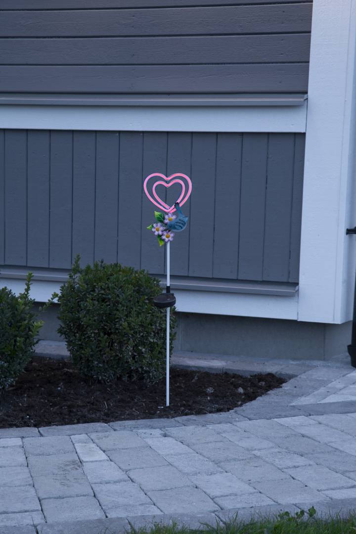 Aurinkokennolla toimiva koristevalaisin, joka on helppo asettaa esimerkiksi kukkaruukkuun tai istutusten lomaan. Koristeessa on värikkäät metalliyksityiskohdat ja hämärän tullen sydämeen syttyy neonpinkki valo. Hämäräsensorin vuoksi valot palavat ainoastaan hämärällä tai pimeällä.