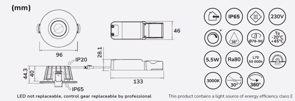 IP65. Kiinteä LED 5,5W, 3000K, 600lm, Ra >80, 36°.