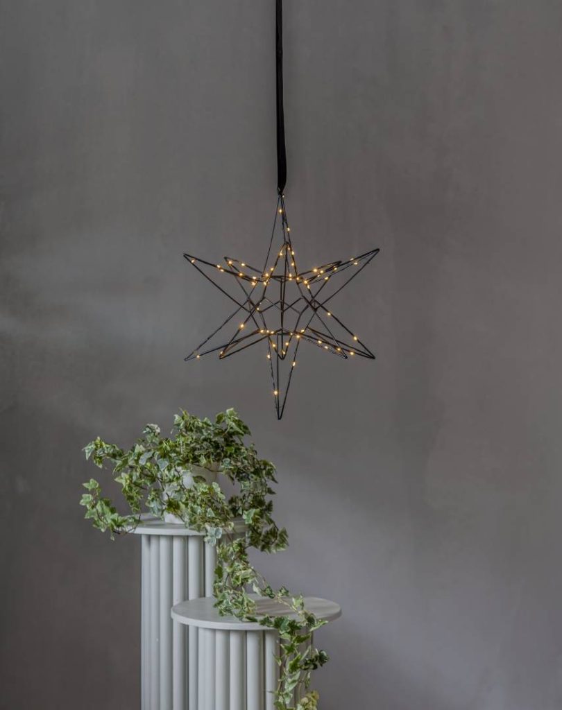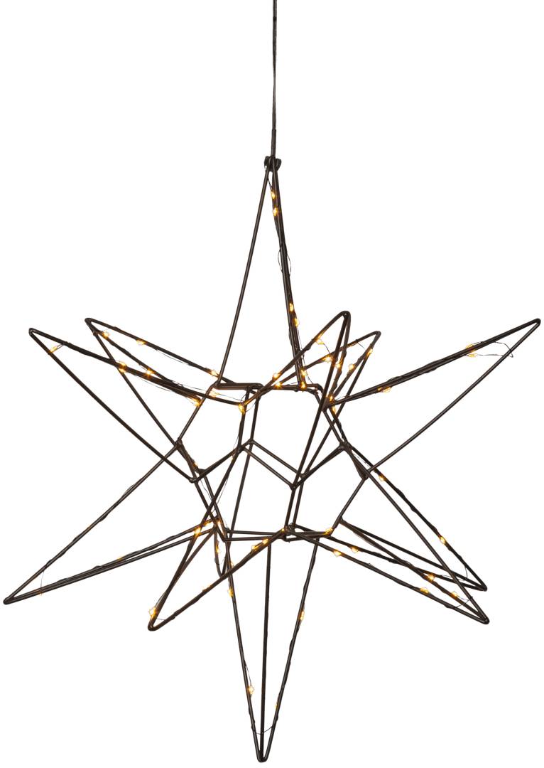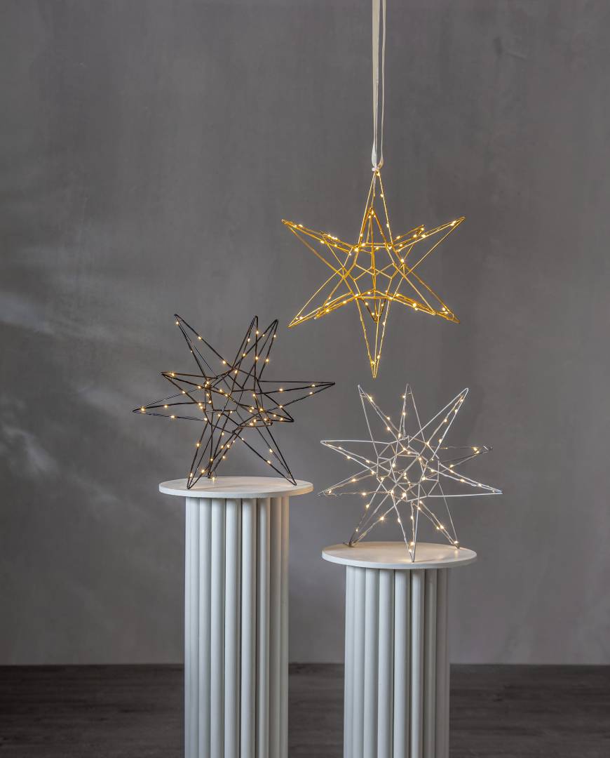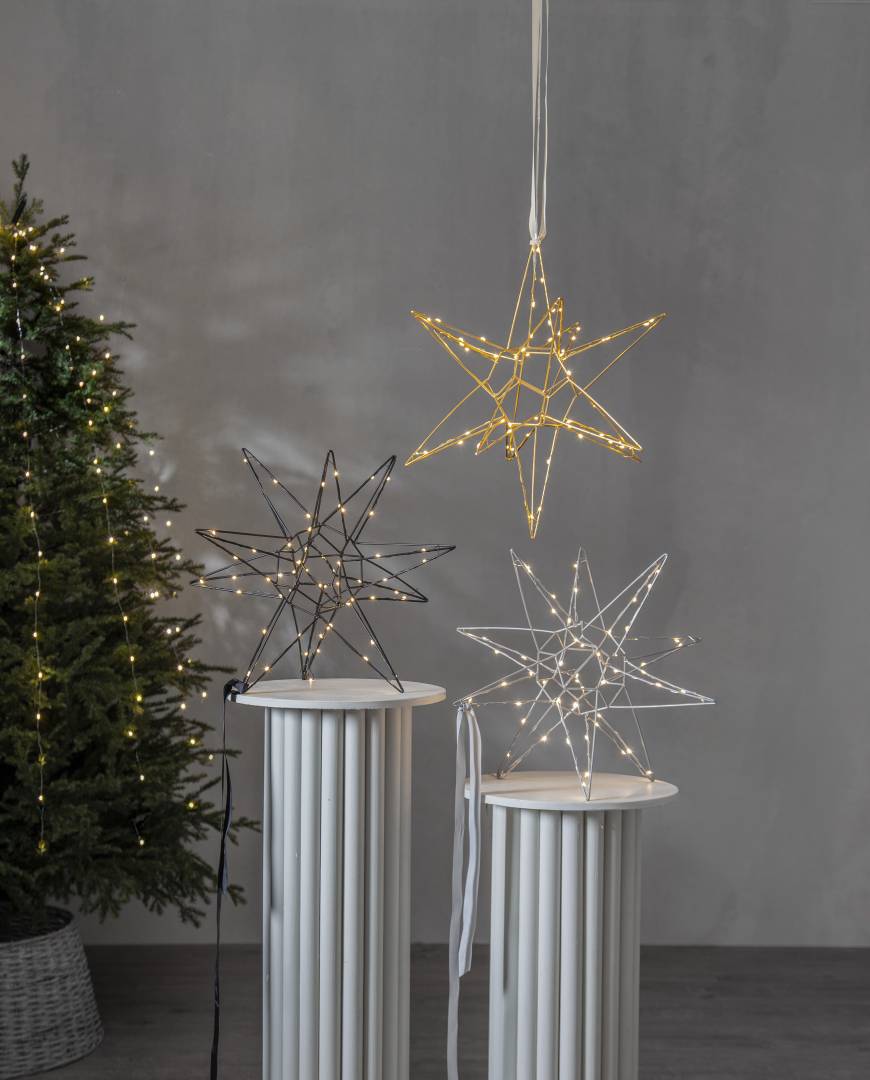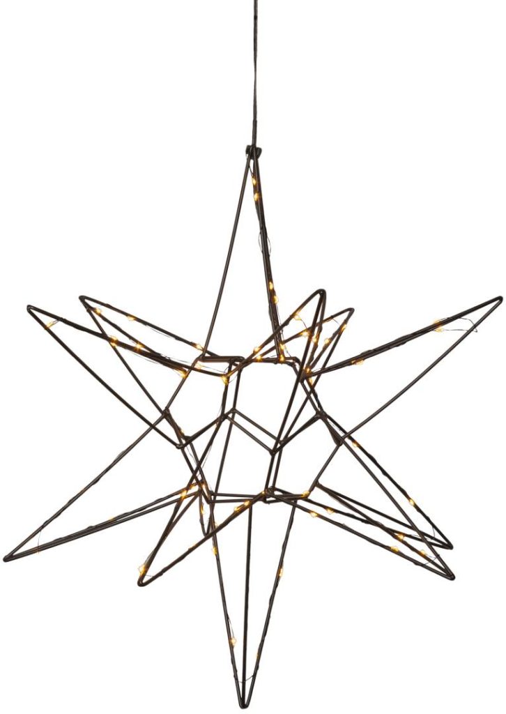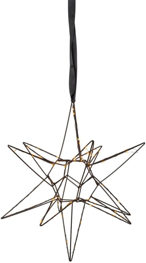 Kaunis kolmiulotteinen musta metallitähti sisäkäyttöön. Tähdessä loistaa 60 lämpimän valkoista LED-valoa. Kaunis koriste esimerkiksi ikkunaan tai vaikka lipaston päällä. Sopii tunnelmavaloksi kaikkina pimeinä talvikuukausina.