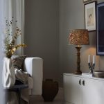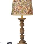 Pöytävalaisinpaketti, jossa on 38 cm korkea puusta sorvattu Lodge-lampunjalka ja Sofia Theo -varjostin polyesteri-puuvilla-pellavakangasta.