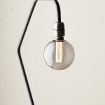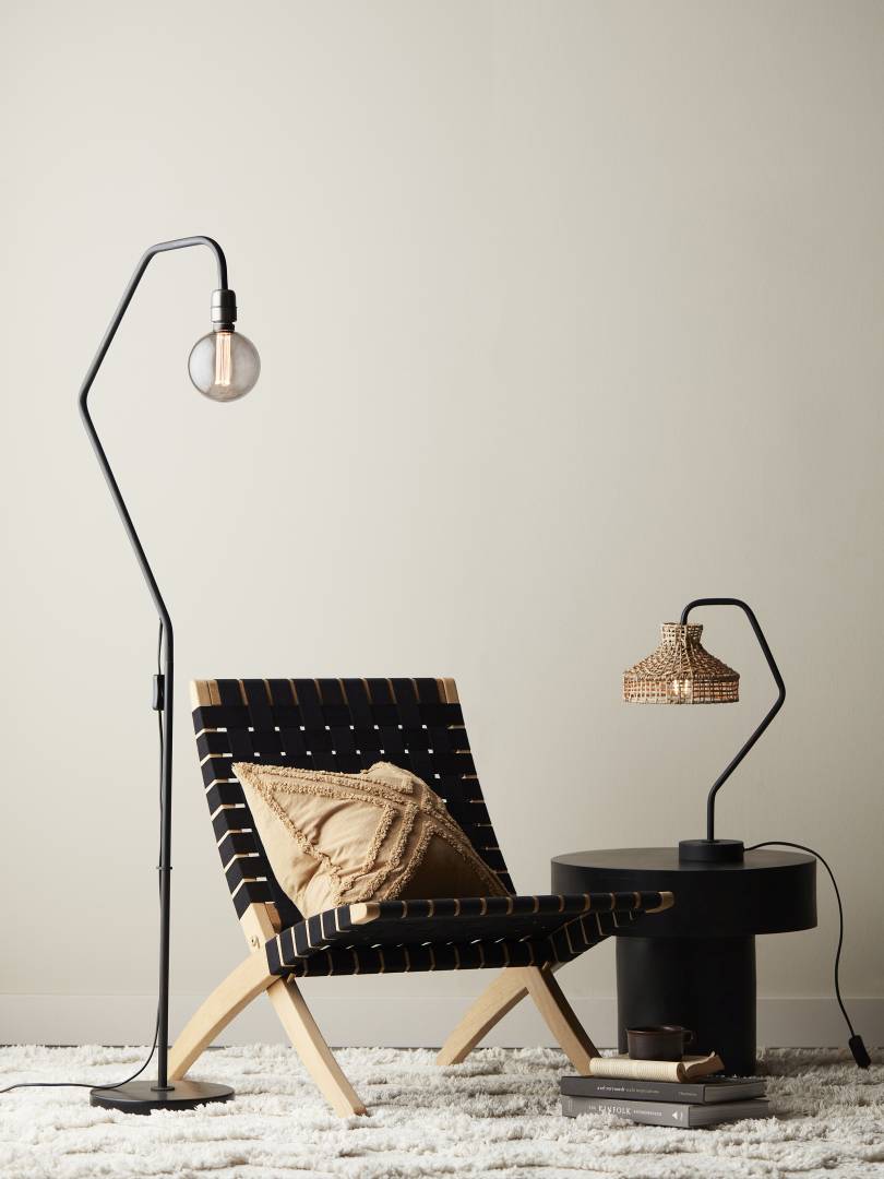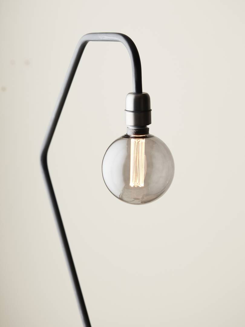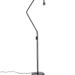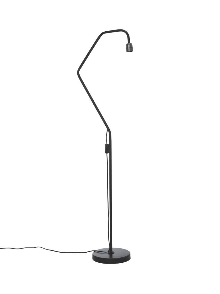 Minimalistinen ja industrial-tyylinen lattiavalaisin mattamustaa ja tummanharmaata metallia.
