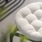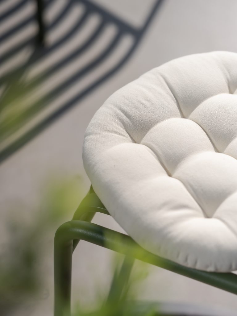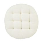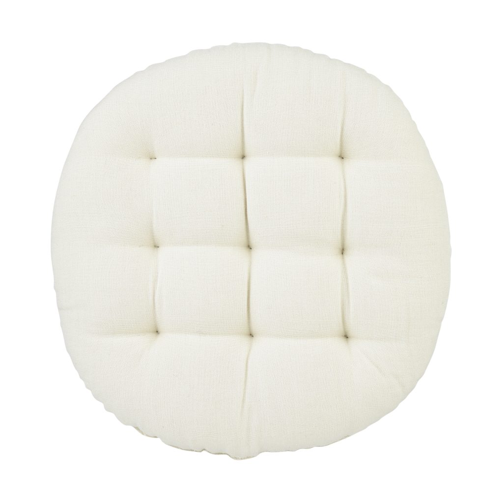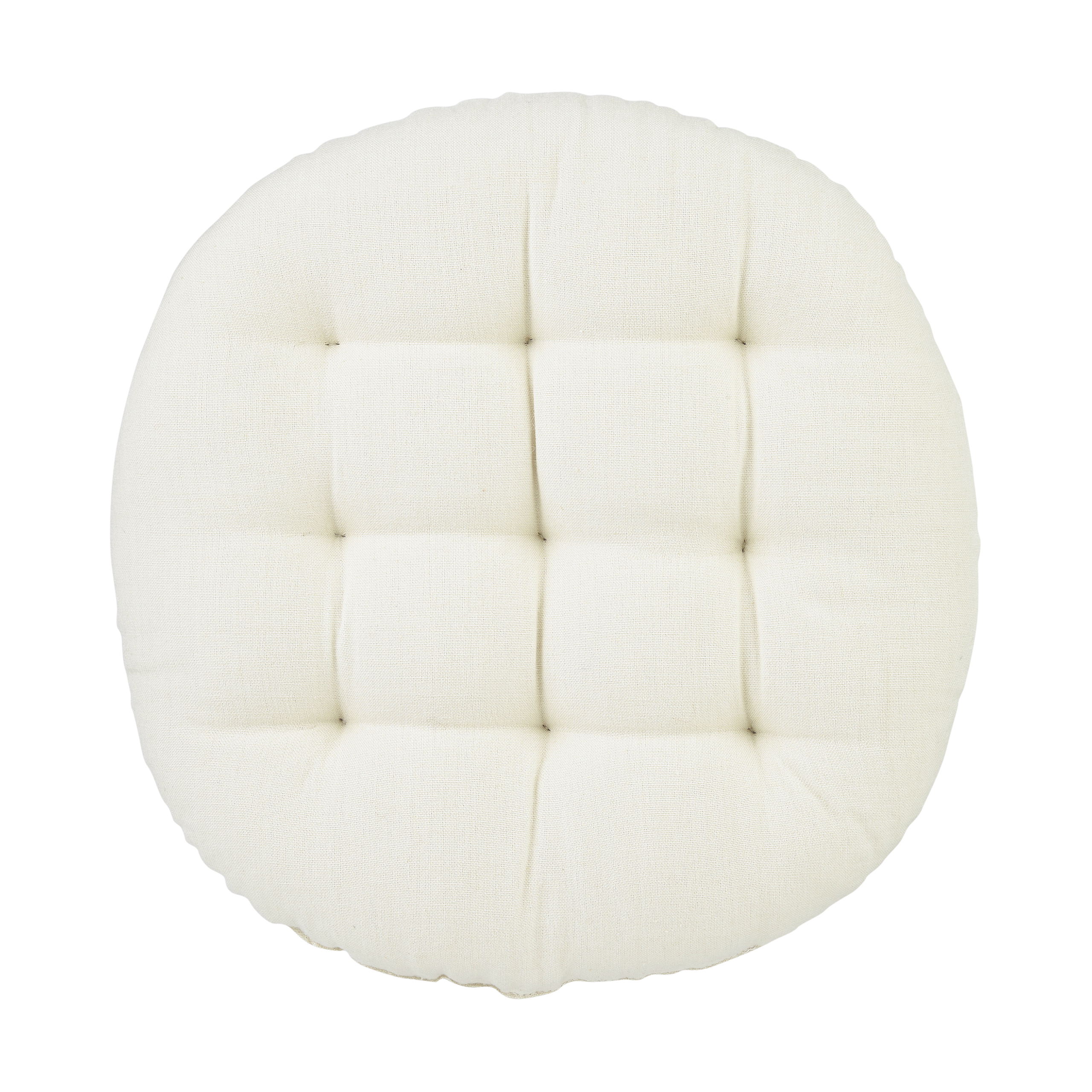 Pyöreä istuintyyny pehmeää puuvillakangasta. Koristeompeleet, polyesteritäyte.