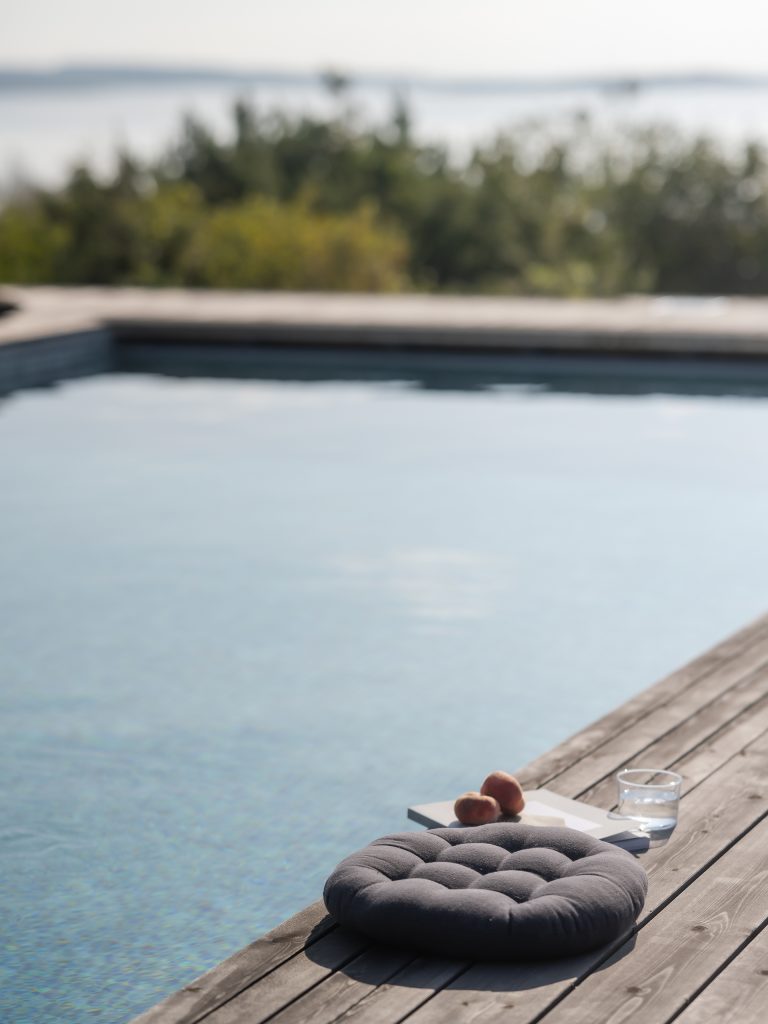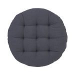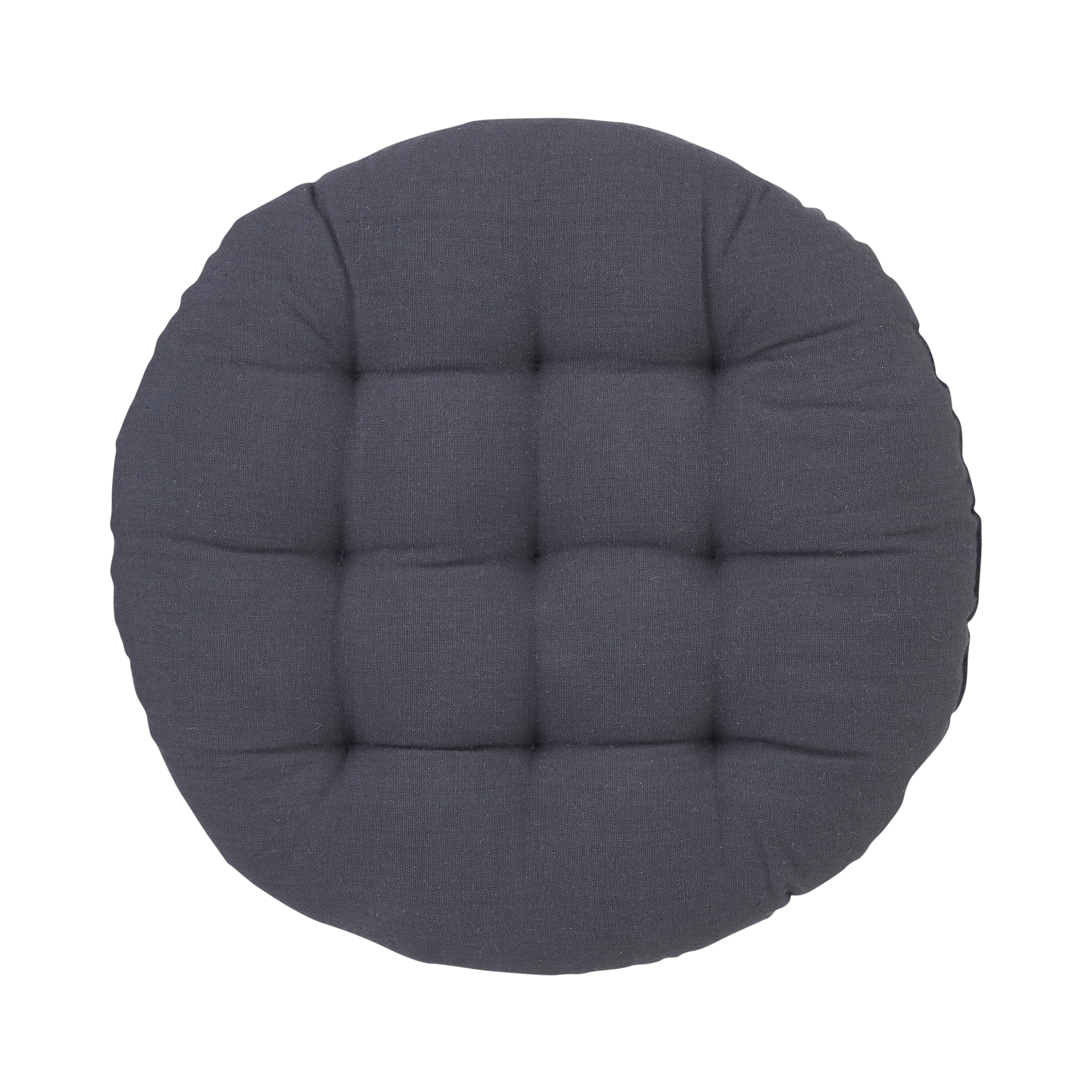 Pyöreä istuintyyny pehmeää puuvillakangasta. Koristeompeleet, polyesteritäyte.