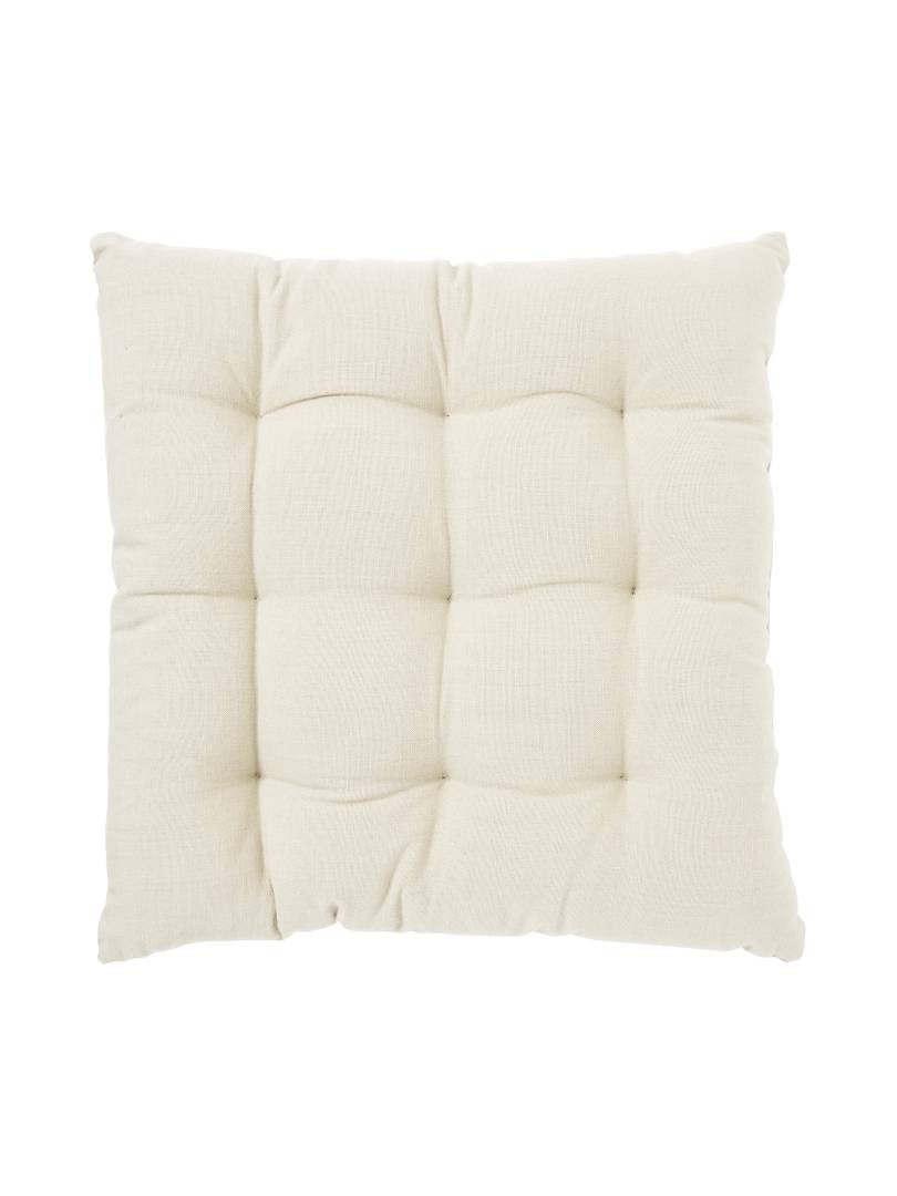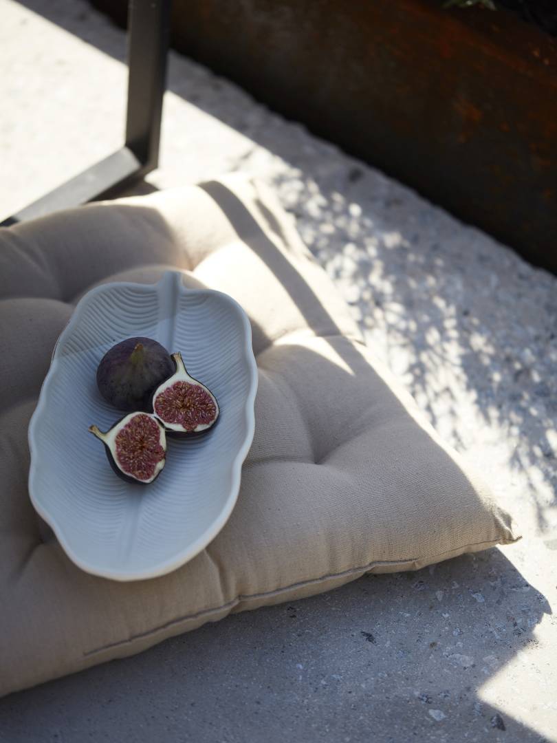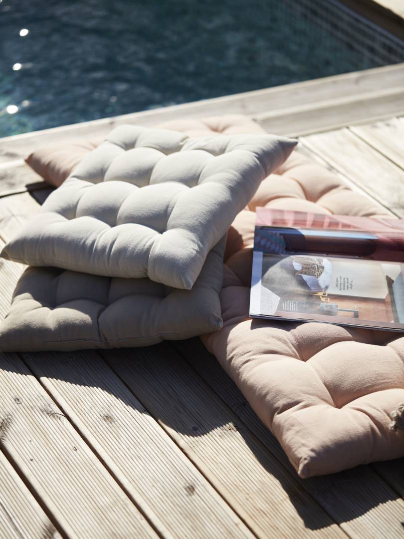 Tuolin pehmuste pehmeää puuvillakangasta. Koristeompeleet, polyesteritäyte.