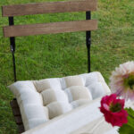 Tuolin pehmuste pehmeää puuvillakangasta. Koristeompeleet, polyesteritäyte.