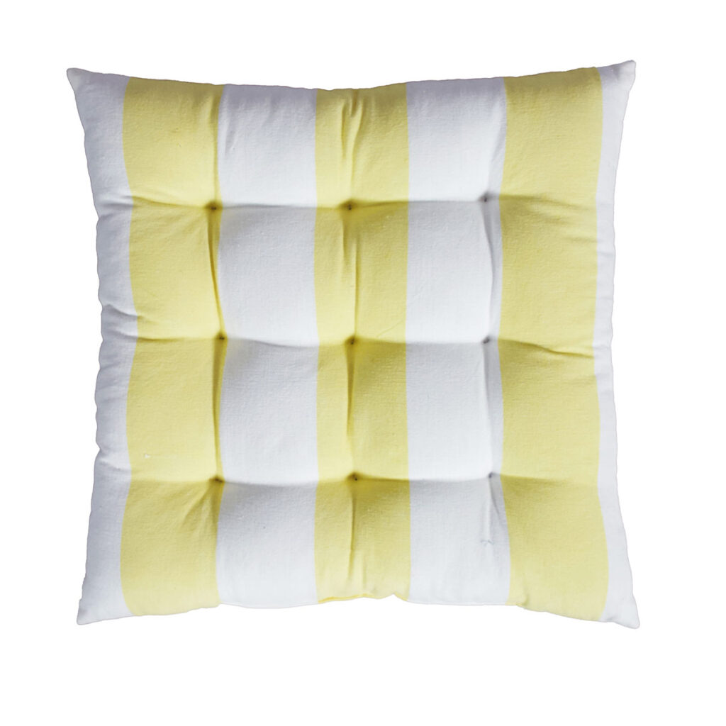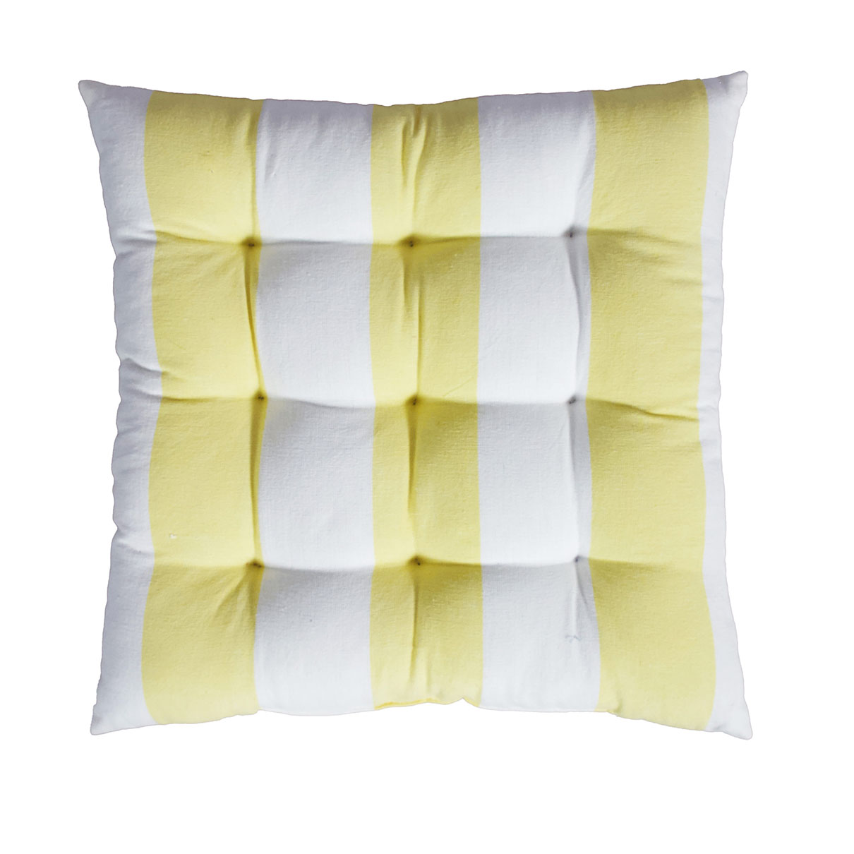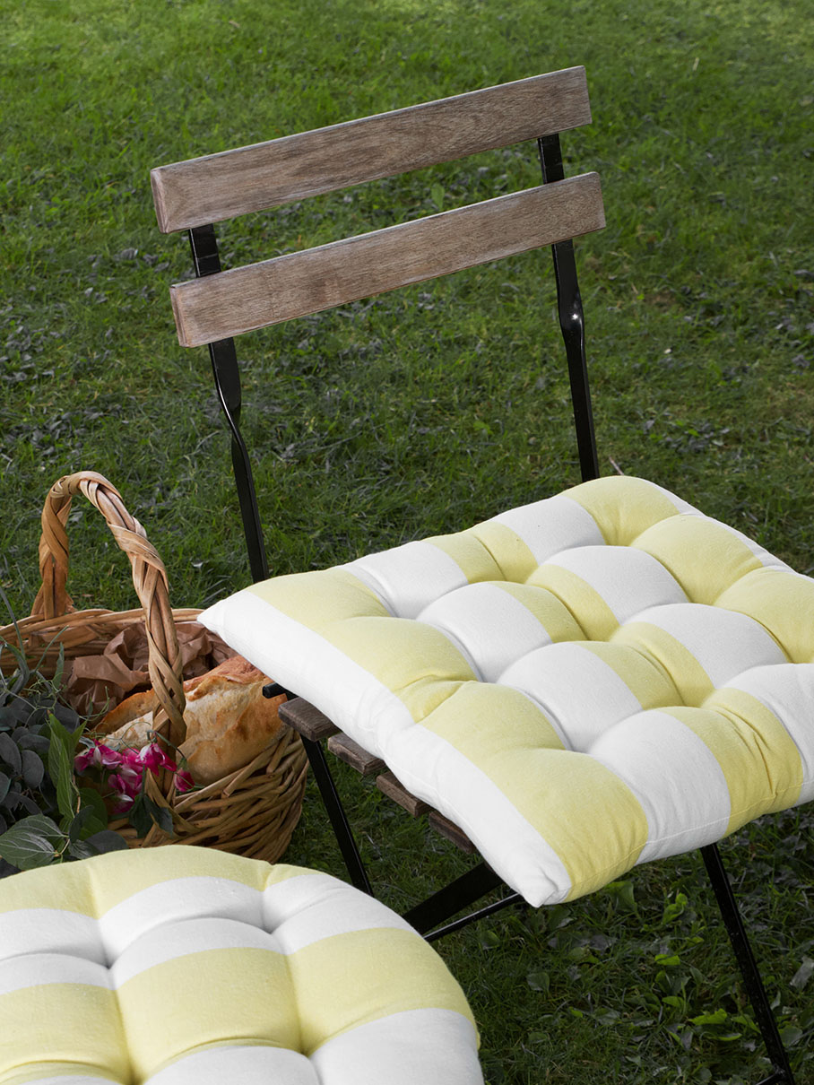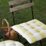 Tuolin pehmuste pehmeää puuvillakangasta. Koristeompeleet, polyesteritäyte.