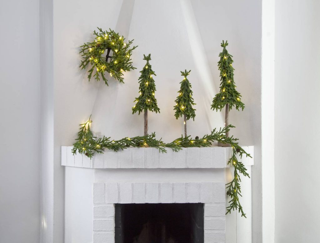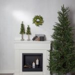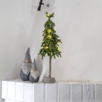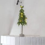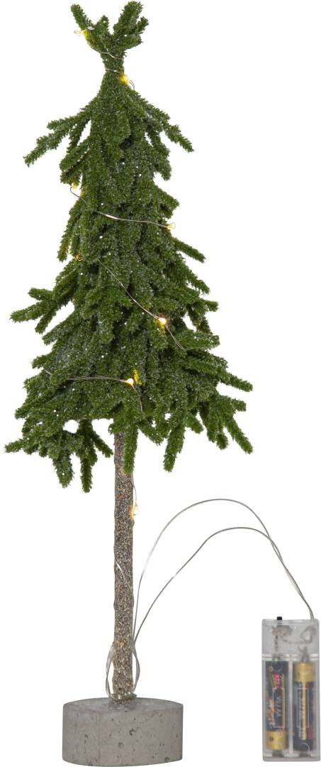 Polyeteenistä valmistettu paristokäyttöinen koristepuu, jossa koristeena glitteriä ja