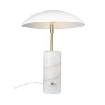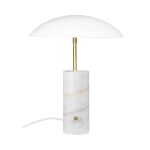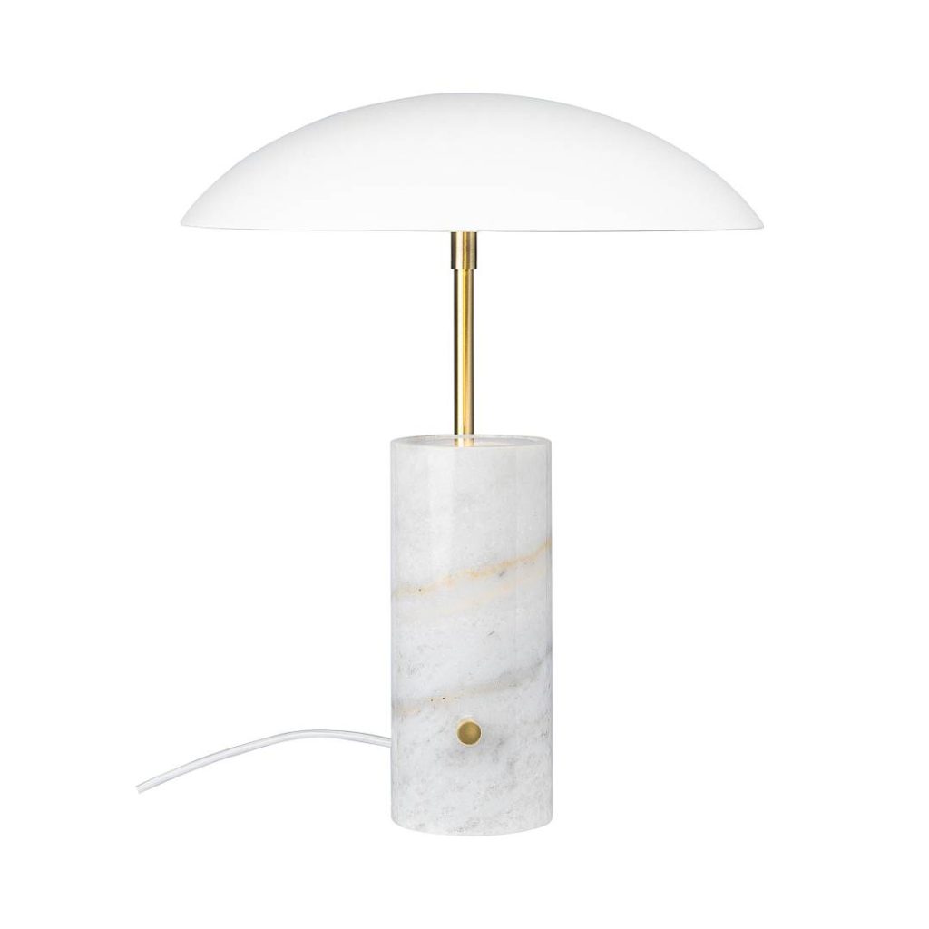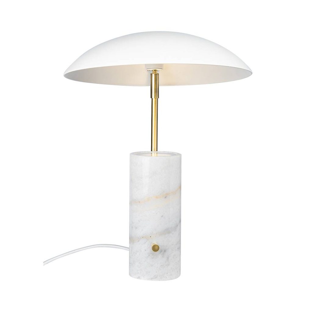 Jykevä marmorijalusta tasapainottaa Mademoiselles-pöytävalaisimen suurikokoista varjostinta. Valo heijastuu jalustasta ylöspäin varjostimeen, mikä luo pehmeän, epäsuoran valaistuksen.