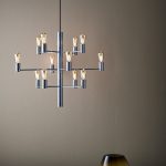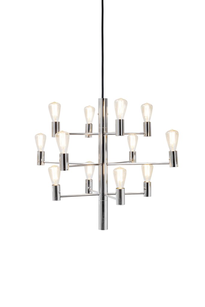 E14, max 12 x 25W. Pakkaus sisältää himmennettävät valonlähteet.