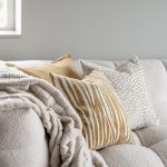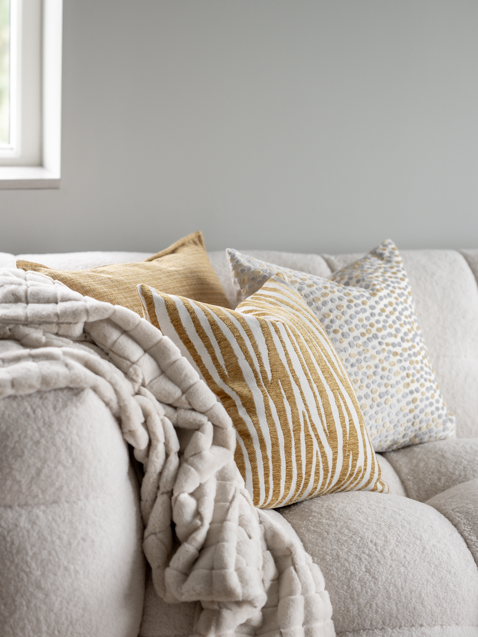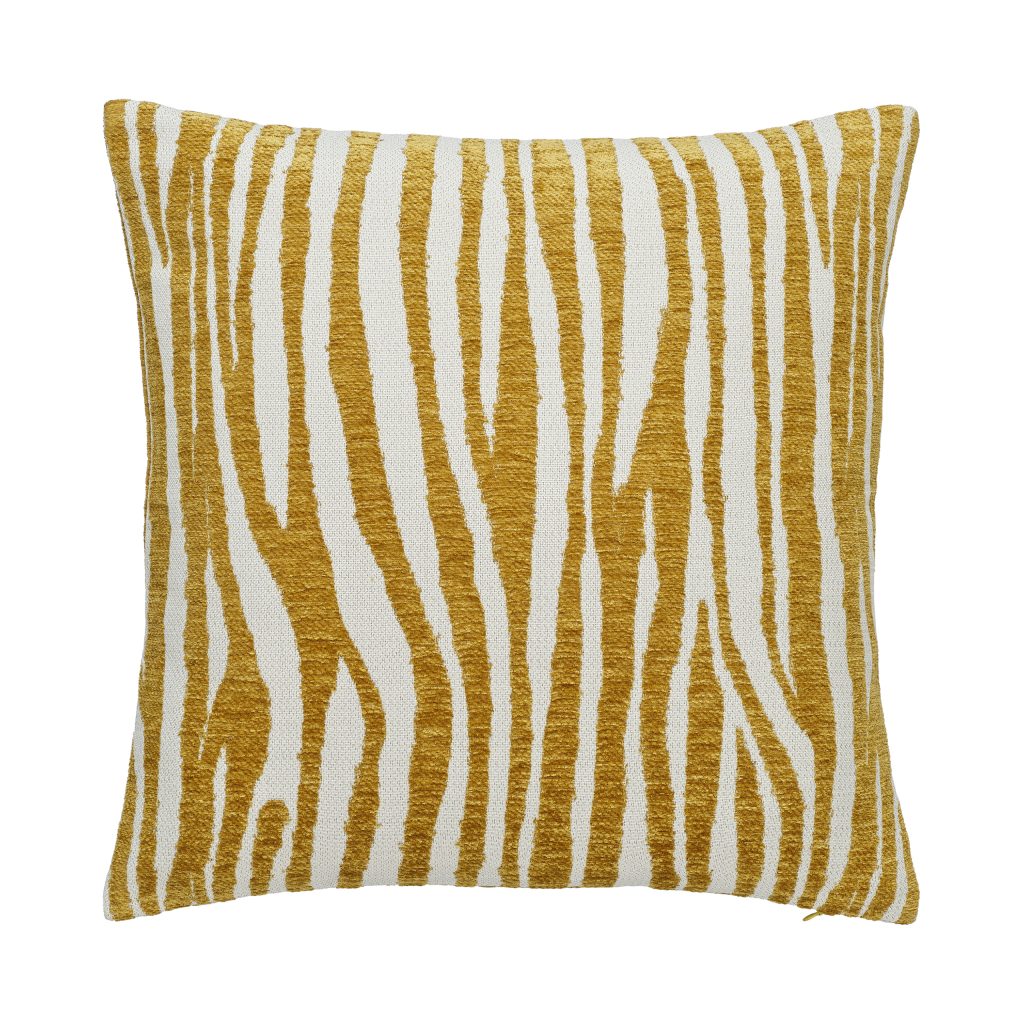 Tyynynpäällinen, jossa on yksivärinen taustakangas ja samettinen kohokuvio. Vetoketju alareunassa.