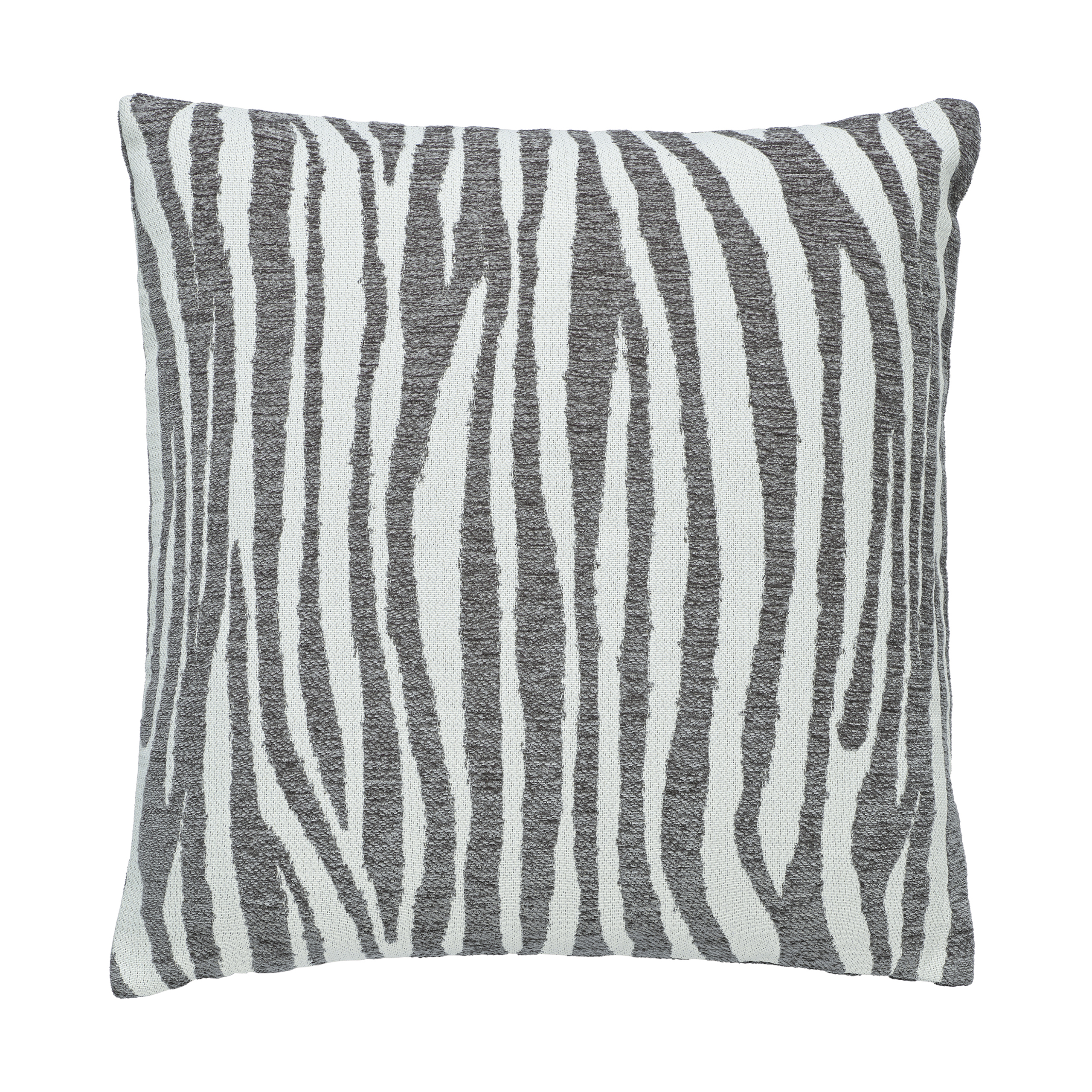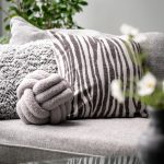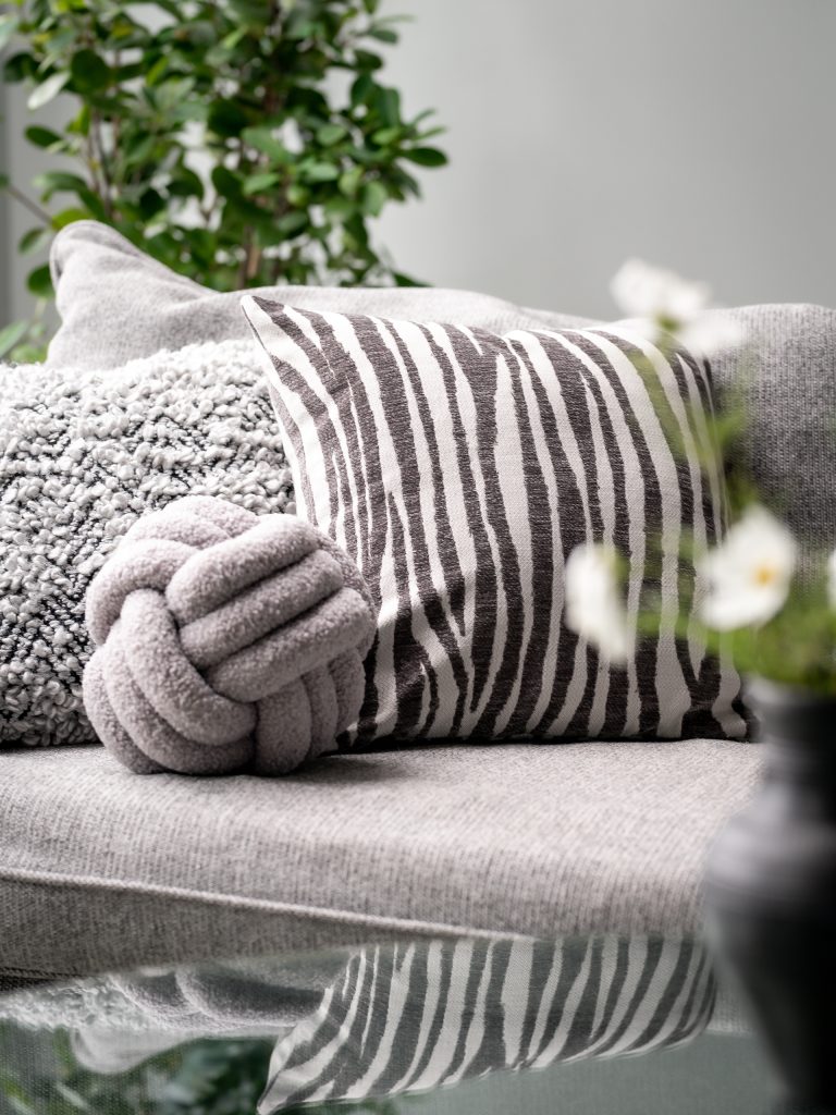 Tyynynpäällinen, jossa on yksivärinen taustakangas ja samettinen kohokuvio. Vetoketju alareunassa.