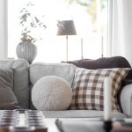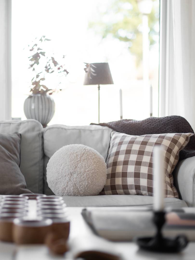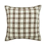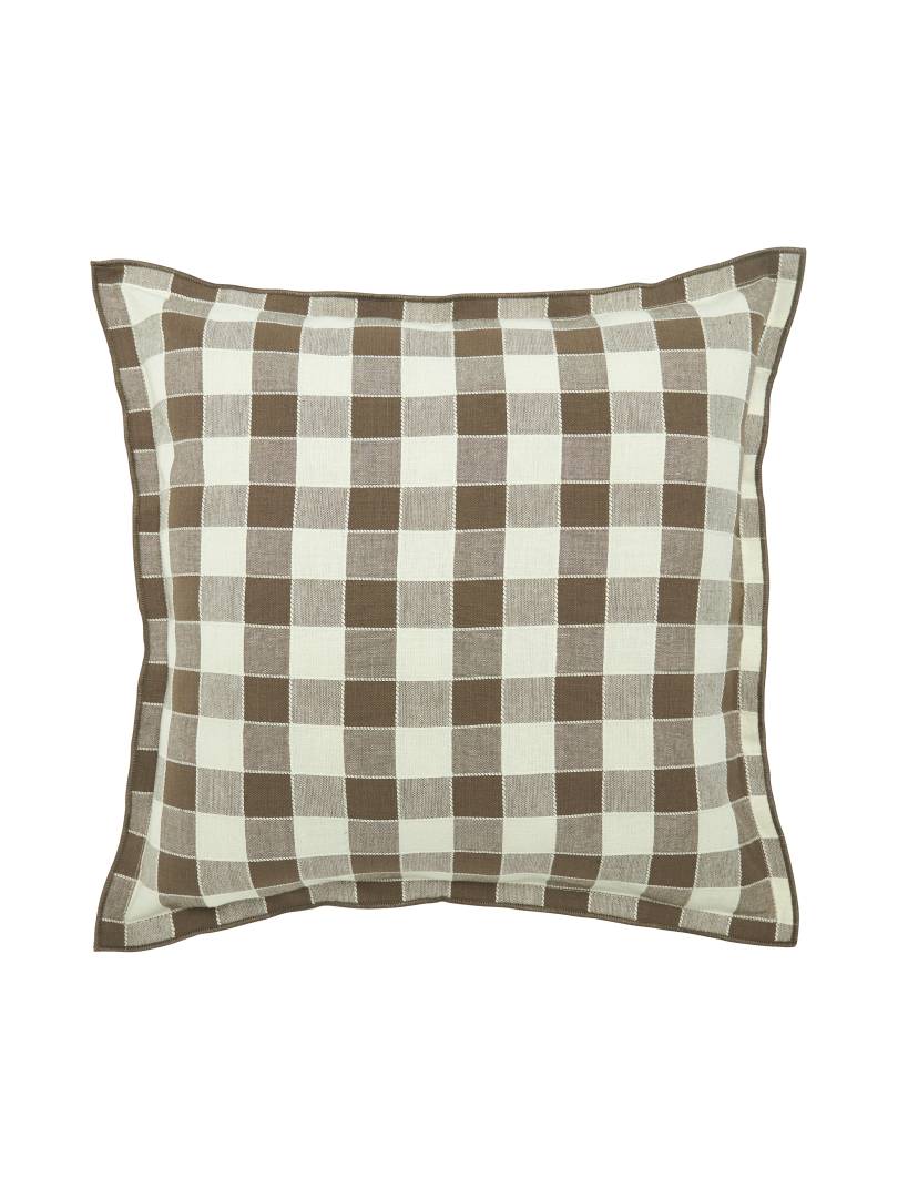 Puuvillainen tyynynpäällinen lankavärjätyillä ruuduilla, reunoissa yliluotteluommel. Vetoketju alareunassa.