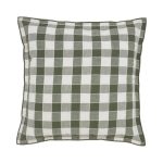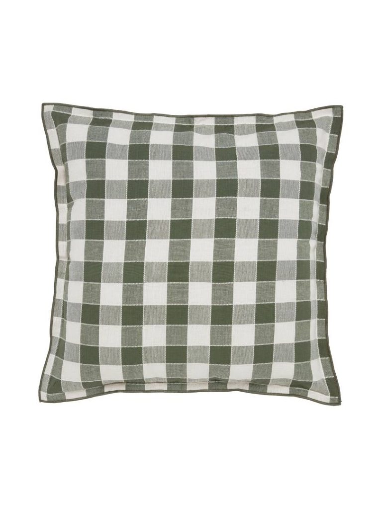 Puuvillainen tyynynpäällinen lankavärjätyillä ruuduilla, reunoissa yliluotteluommel. Vetoketju alareunassa.