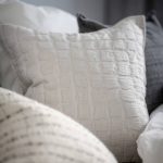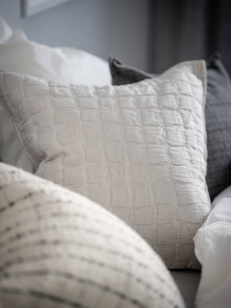 Matelassé-tekniikalla valmistettu tyynynpäällinen. Kangas on kudottu kahteen kerrokseen, jolloin pintaan muodostuu kohokuvio. Vetoketju alareunassa.
