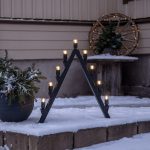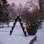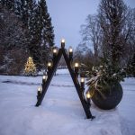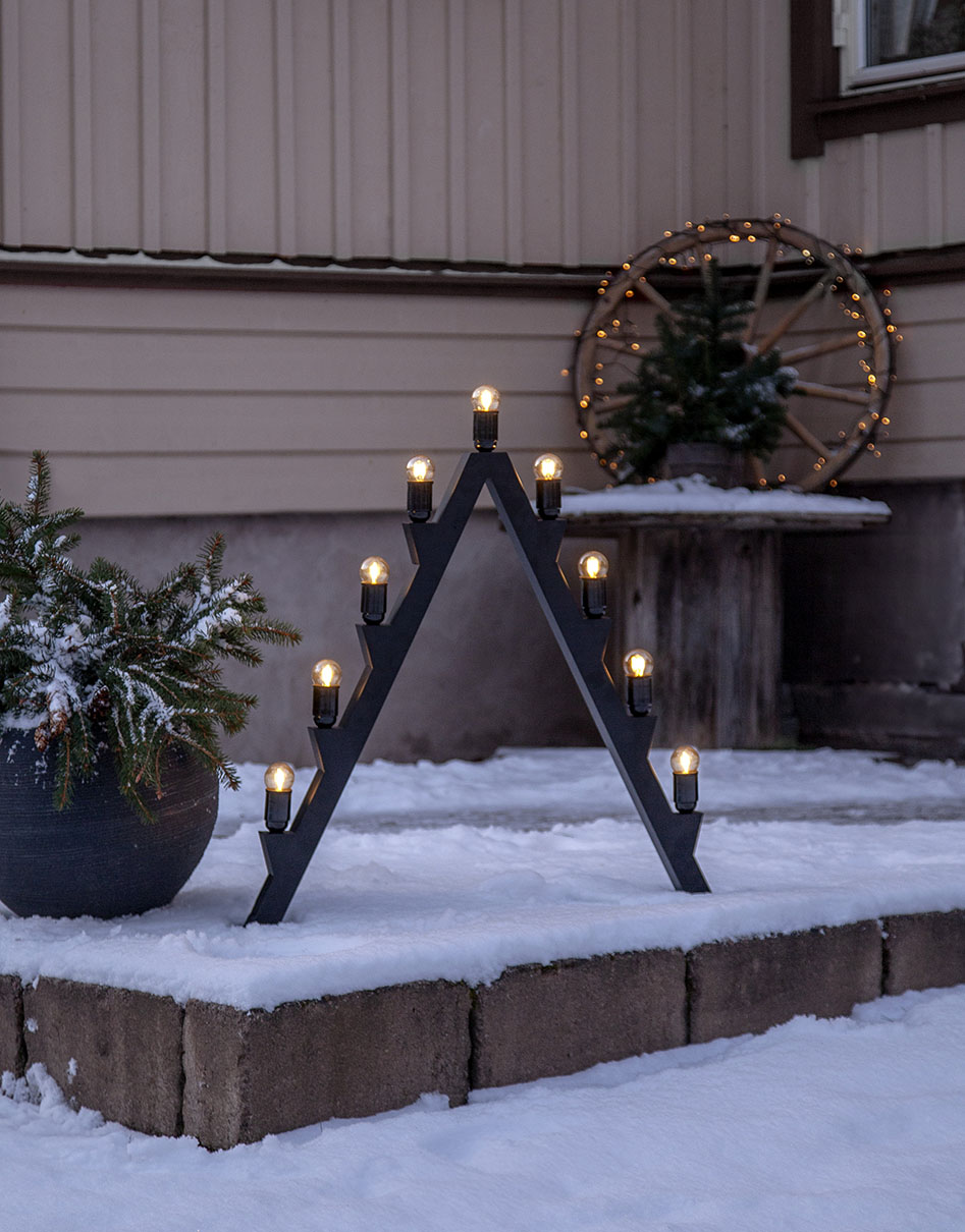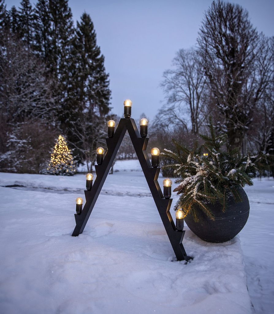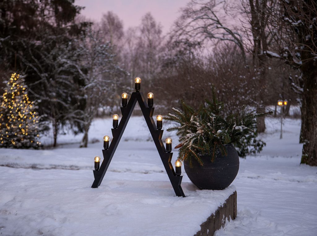 Ulkokäyttöön sopiva suurikokoinen moderni kynttelikkö mustaa metallia.
