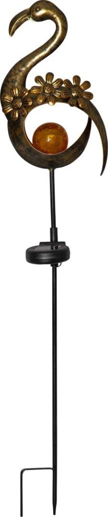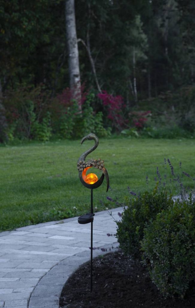 Melilla Bird on aurinkokennolla toimiva pronssin värinen koristevalaisin, jossa on koristeena lintu ja kukkia. Sopii esimerkiksi istutusten lomaan puutarhaan, tai ruukkuun terassille tai parvekkeelle. Meripihkan värisessä lasipallossa loistaa hämärän tullen meripihkan sävyinen valo.