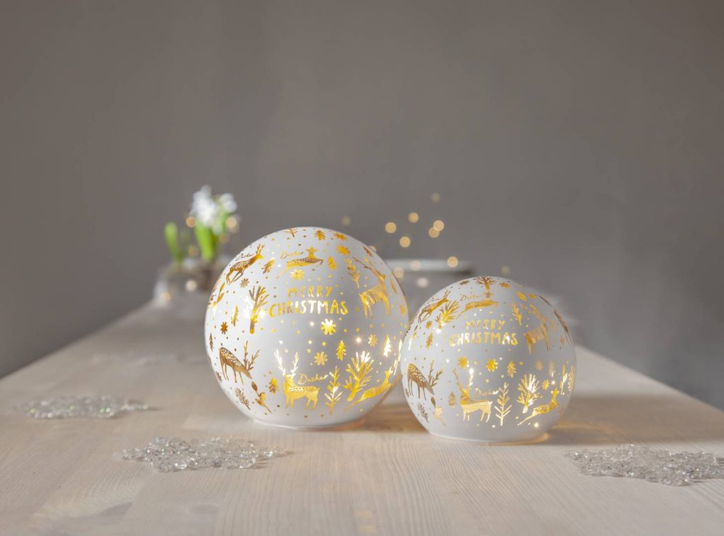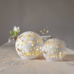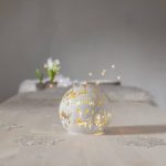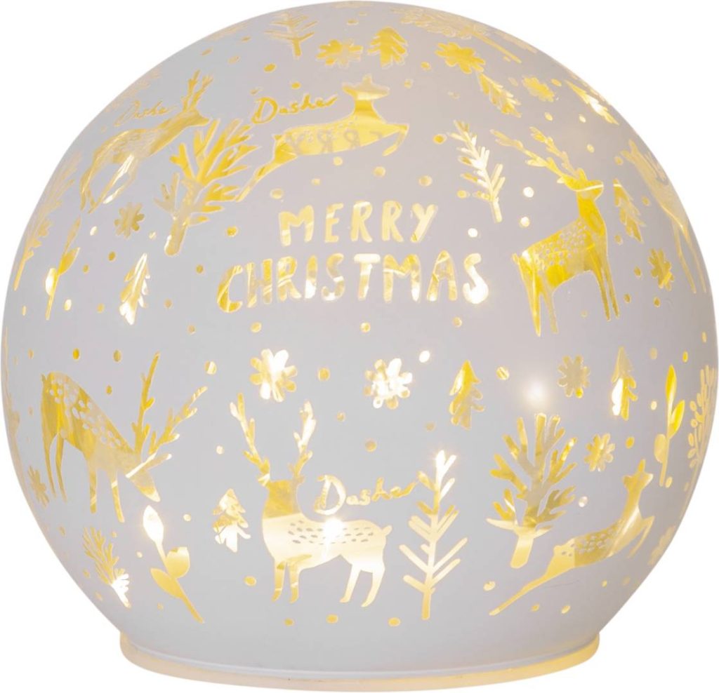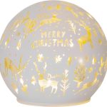 Kaunis jouluisilla kuvioilla koristeltu lasipallo, joka sopii esimerkiksi joulupöytään koristeeksi. Valaistuksena lämpimän valkoinen LED-valo. Sisäkäyttöön.