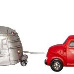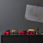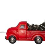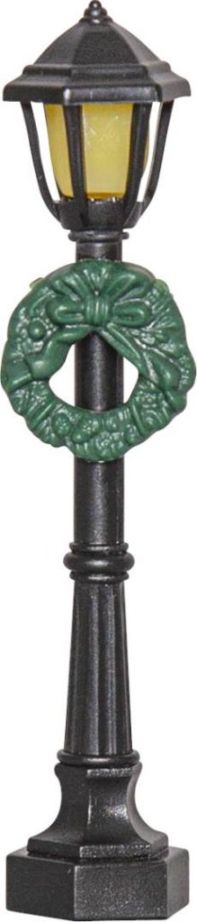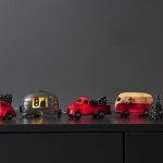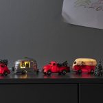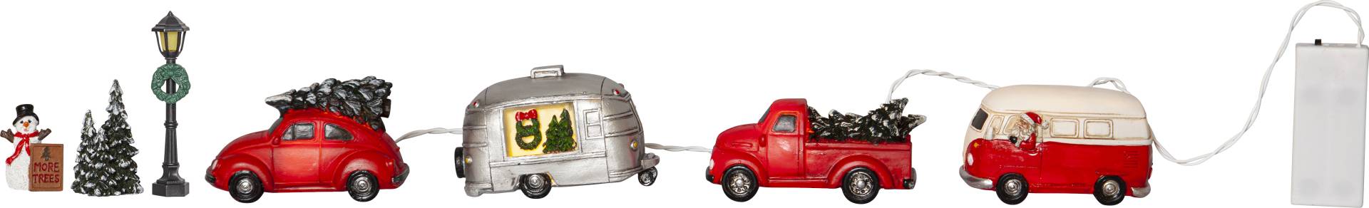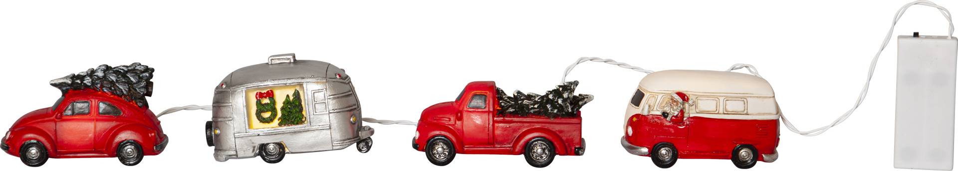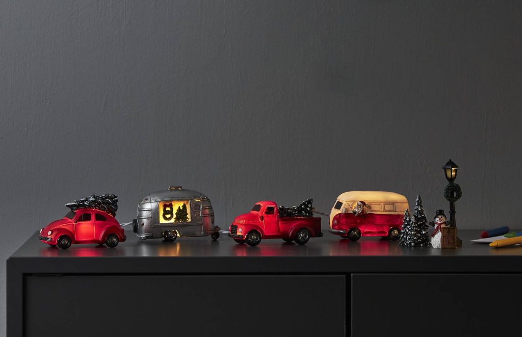 Pöytäkoriste, jossa kolme erilaista autoa, asuntovaunut, lyhtypylväs, kuuset sekä lumiukkohahmo. Valaistuksena lämpimän valkoiset LED-valot. Sisäkäyttöön.
