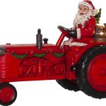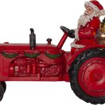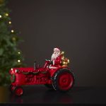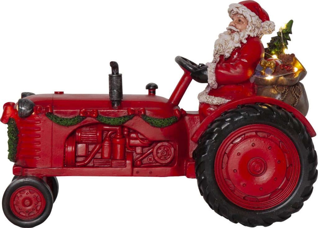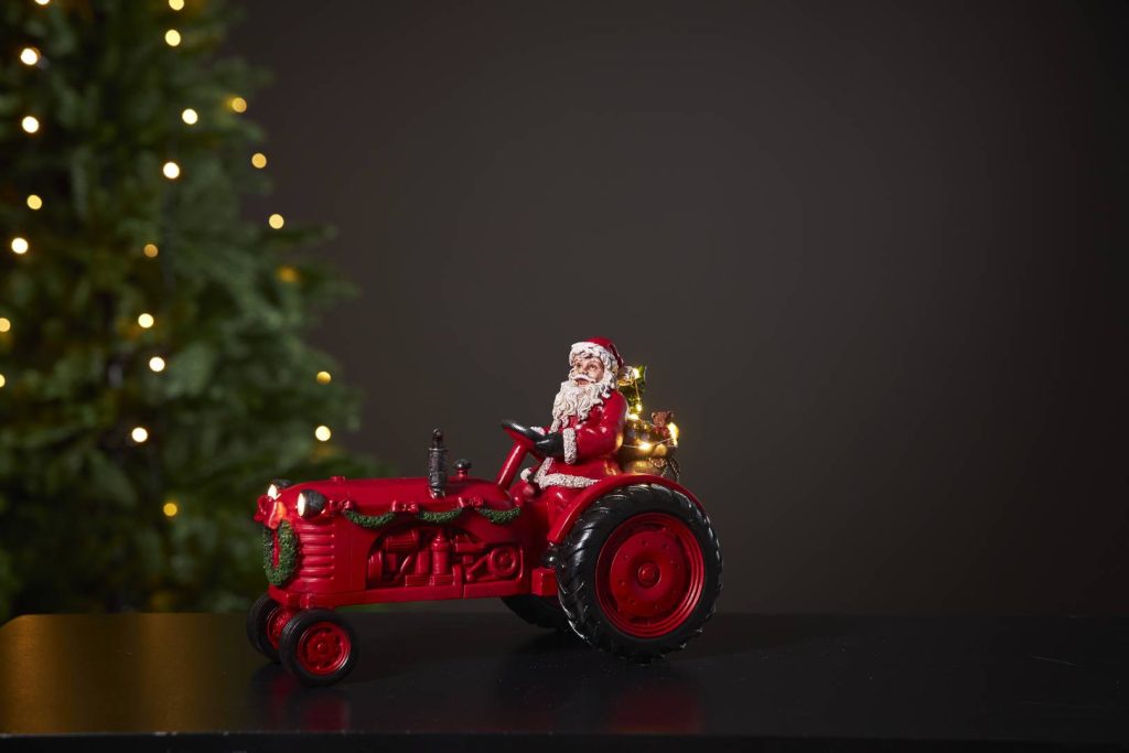 joulupukki lahjasäkkeineen istuu traktorin kyydissä. Lahjasäkin ympärillä ja