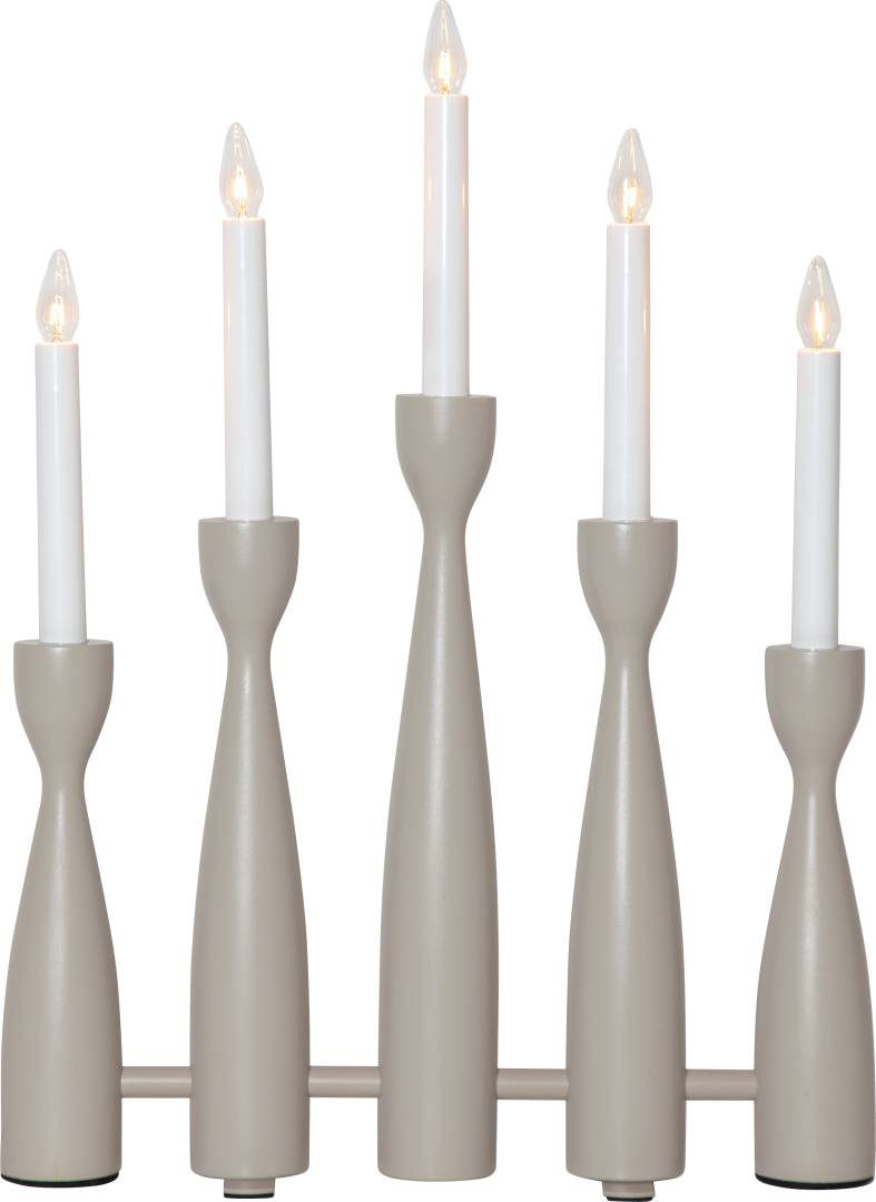 Kynttelikössä on 5 vaihdettavaa lamppua ja 180 cm pitkä valkoharmaa tekstiilijohto katkaisijalla.