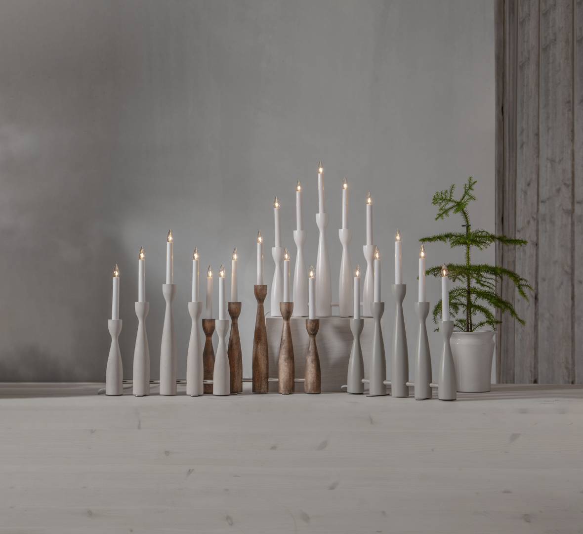 Elegantti ja moderni puukynttelikkö, joka sopii esimerkiksi ikkunalaudalle tai lipaston päälle tuomaan kotiin jouluista tunnelmaa.