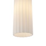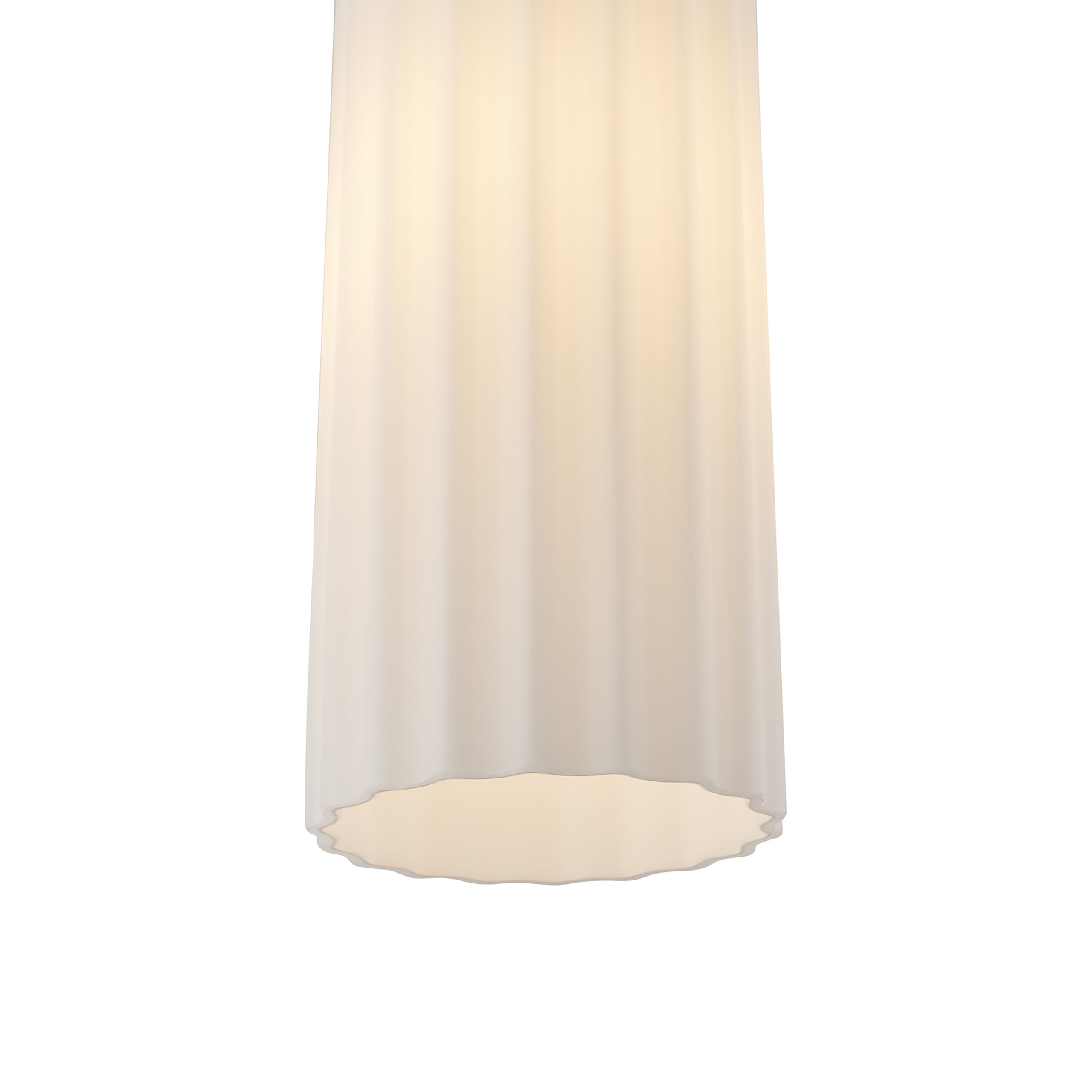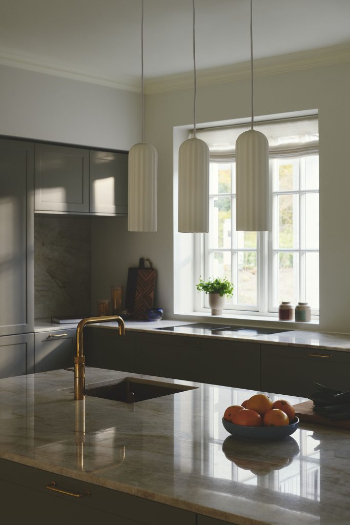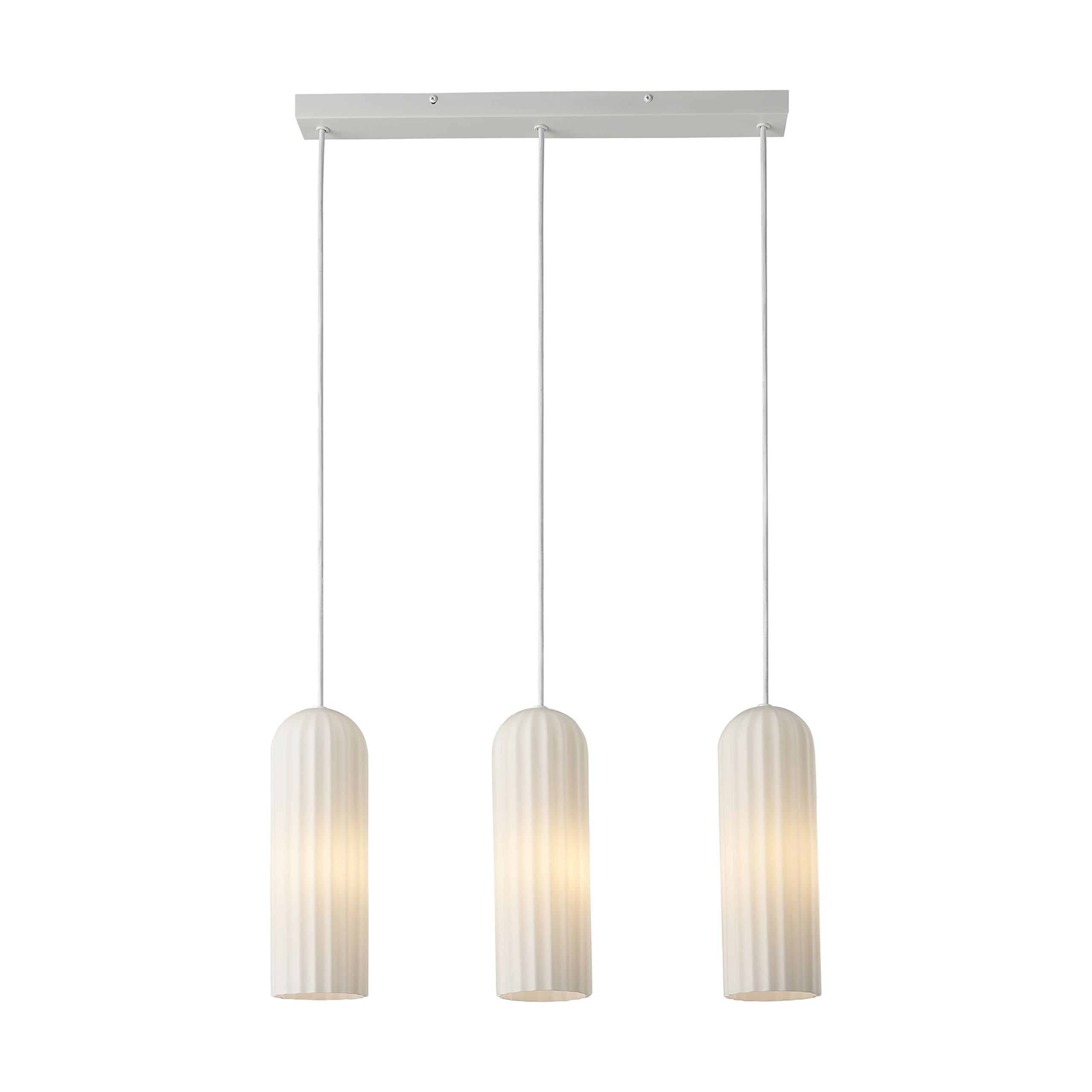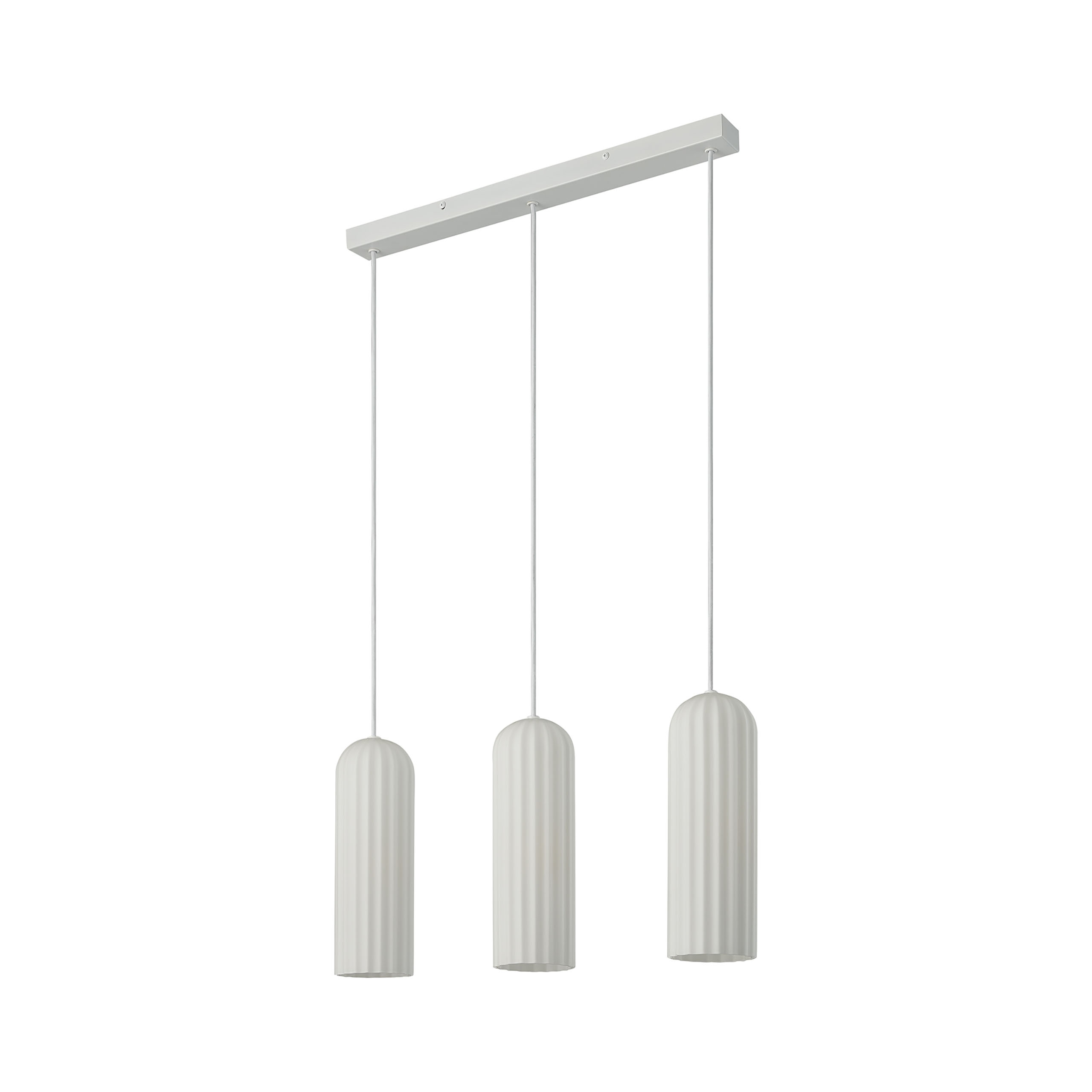 Miella on pelkistetty, mutta elegantti kolmeosainen riippuvalaisin, jonka varjostin on kaunista uurrettua lasia. Valaisin sopii esimerkiksi keittiösaarekkeen tai ruokapöydän yläpuolelle.