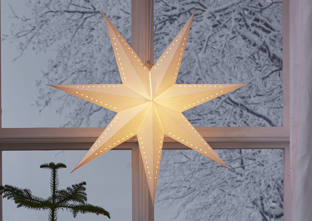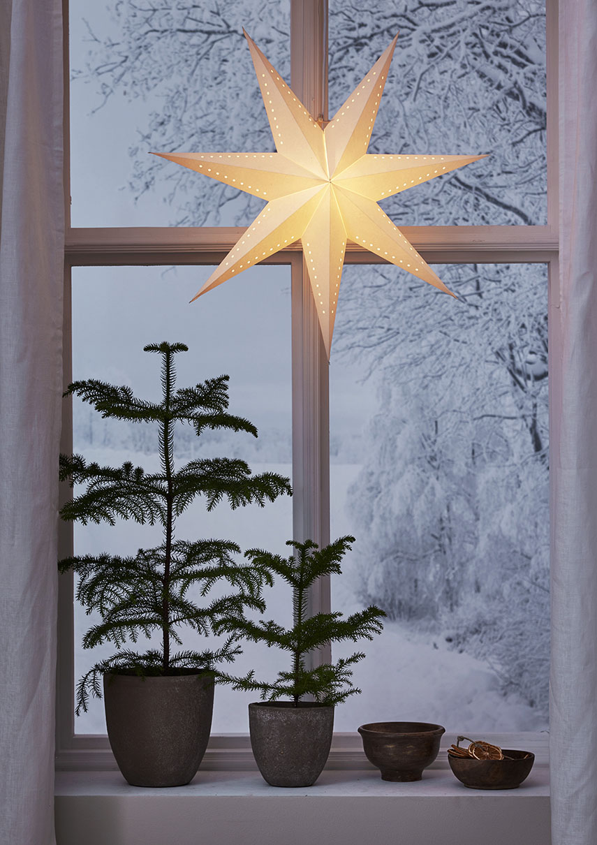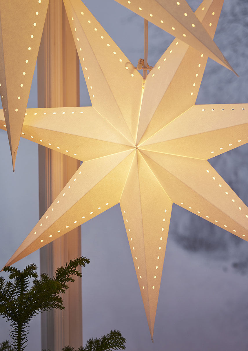 Valkoinen paperitähti tyylikkäällä reikäkuvioinnilla tuo kotiin ihanaa joulutunnelmaa. Ripusta yksi tai useampi tähti ikkunaan tai seinää vasten.