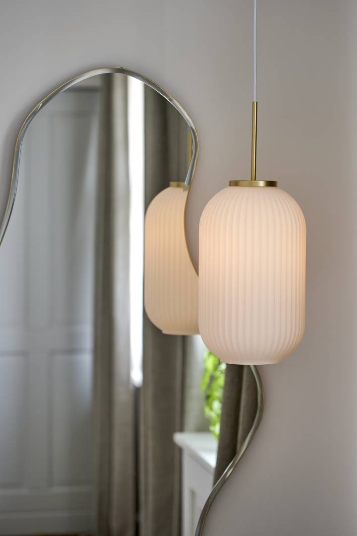 Milford on koristeellinen valaisinsarja, jossa opaalinvalkoinen suupuhallettu lasi luo pehmeän ja melkein ”vekkimäisen” ilmeen. Klassinen ja vintage-tyylinen muotoilu on tasapainotettu modernisti messingillä. Orgaanisten muotojen ja uurretun pinnan yhdistelmä luo eleganssia ja valaisee huoneen pehmeällä ja lämpimällä valolla.
