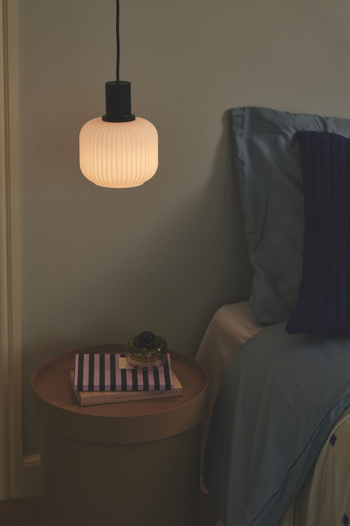 Milford Mini on koristeellinen riippuvalaisin, jonka kaunis opaalivalkoinen uurrettu lasivarjostin luo pehmeää valaistusta. Pelkistetty metallirunko tuo valaisimeen modernin silauksen.