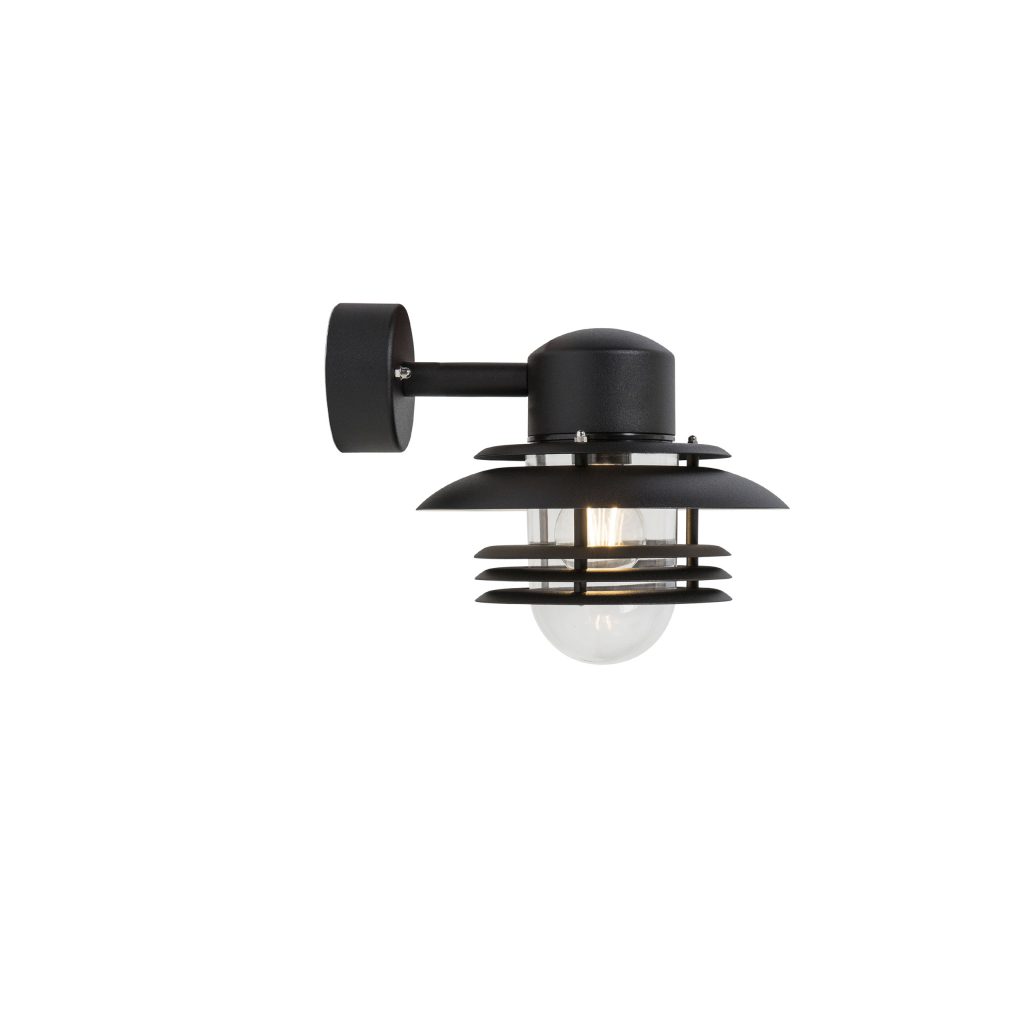 Klassinen ulkoseinävalaisin, jonka runko on metallia ja kupu kirkasta lasia. Valo heijastuu valaisimesta sekä alaspäin että sivuille.