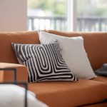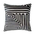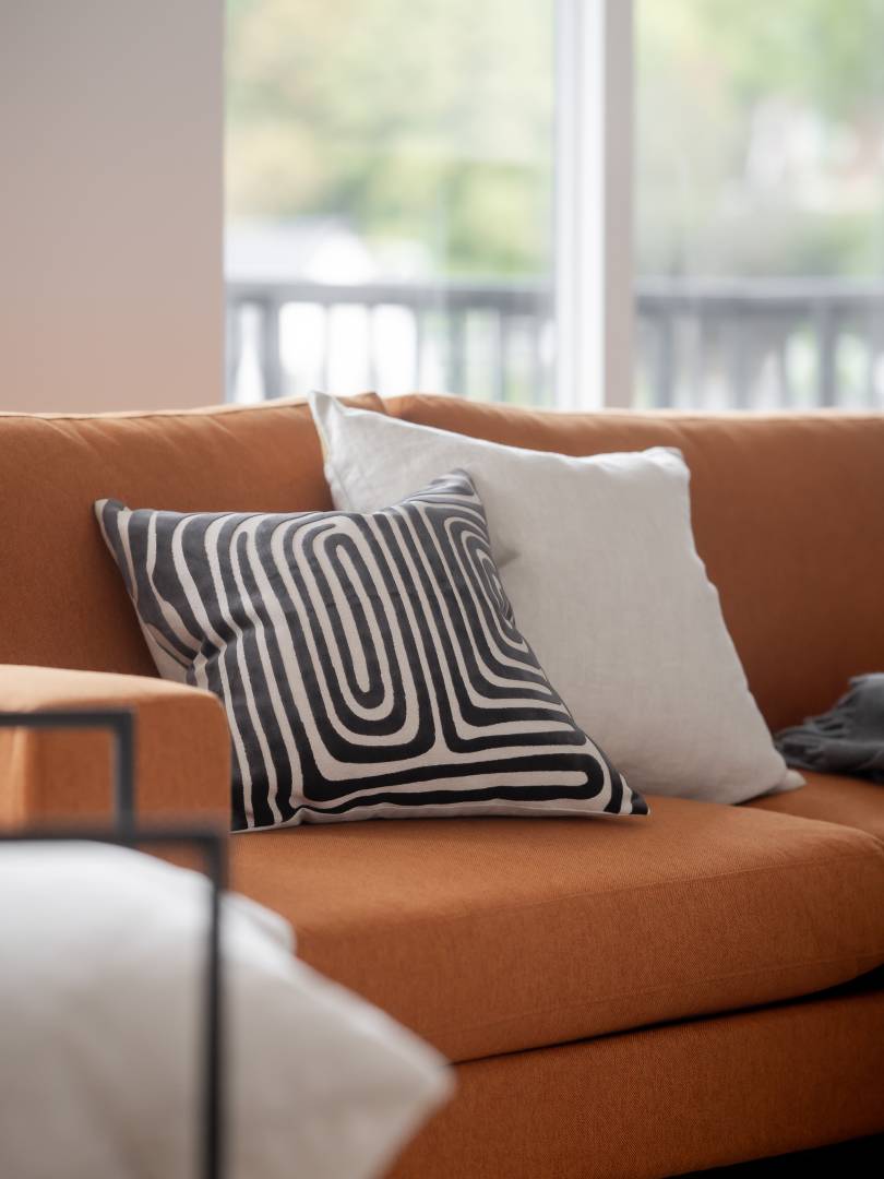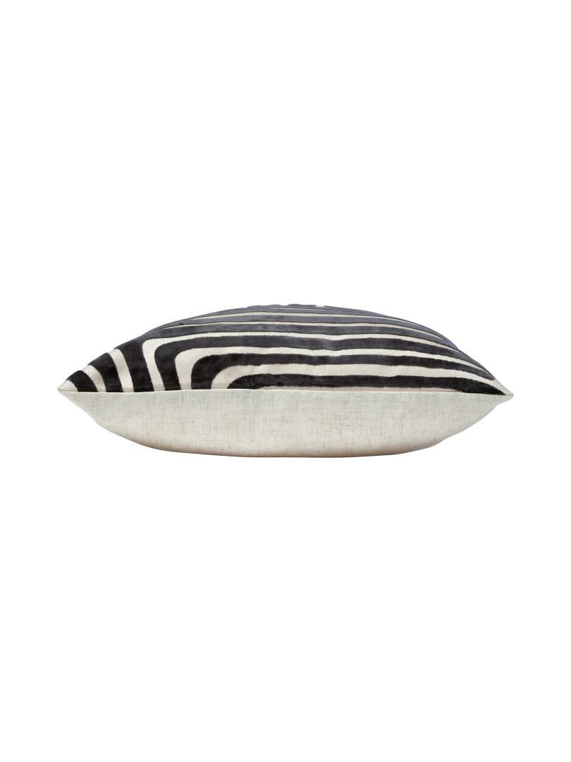 Tyynynpäällinen, jossa on yksivärinen taustakangas ja samettinen kohokuvio. Vetoketju alareunassa.