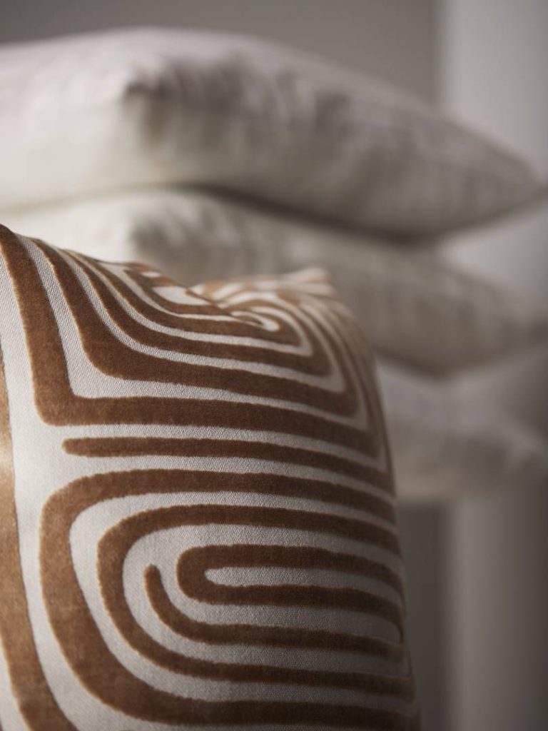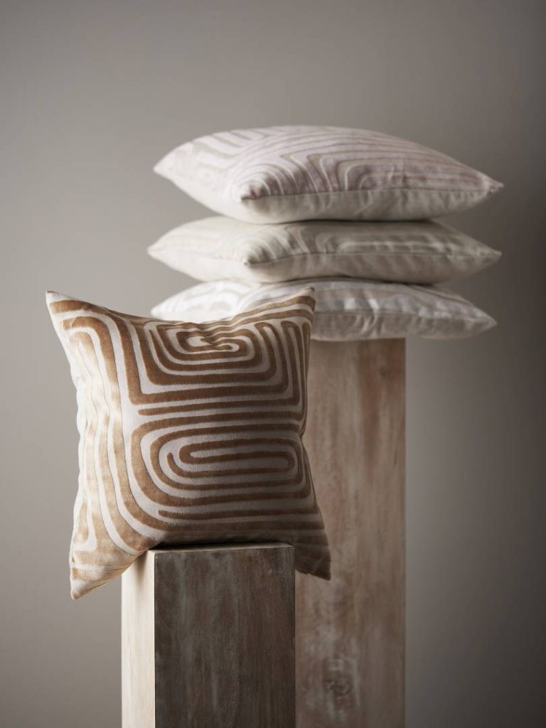 Tyynynpäällinen, jossa on yksivärinen taustakangas ja samettinen kohokuvio. Vetoketju alareunassa.