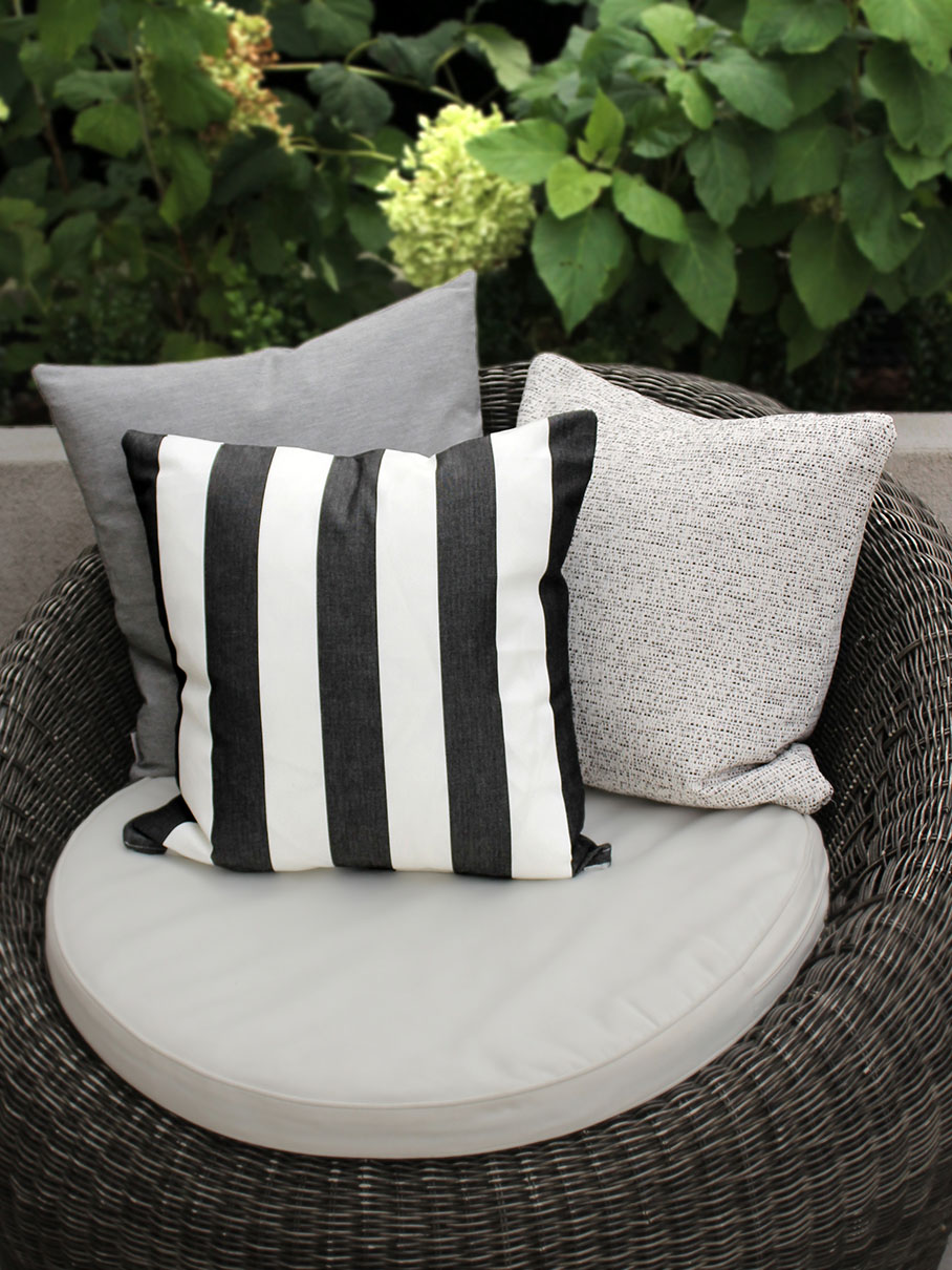 Ulkokäyttöön tarkoitettu tyynynpäällinen. Tyynynpäällisen materiaalina on Dralon, teflonilla käsitelty akryylikuitukangas. Dralon on valonkestävä ja vettähylkivä kangas.