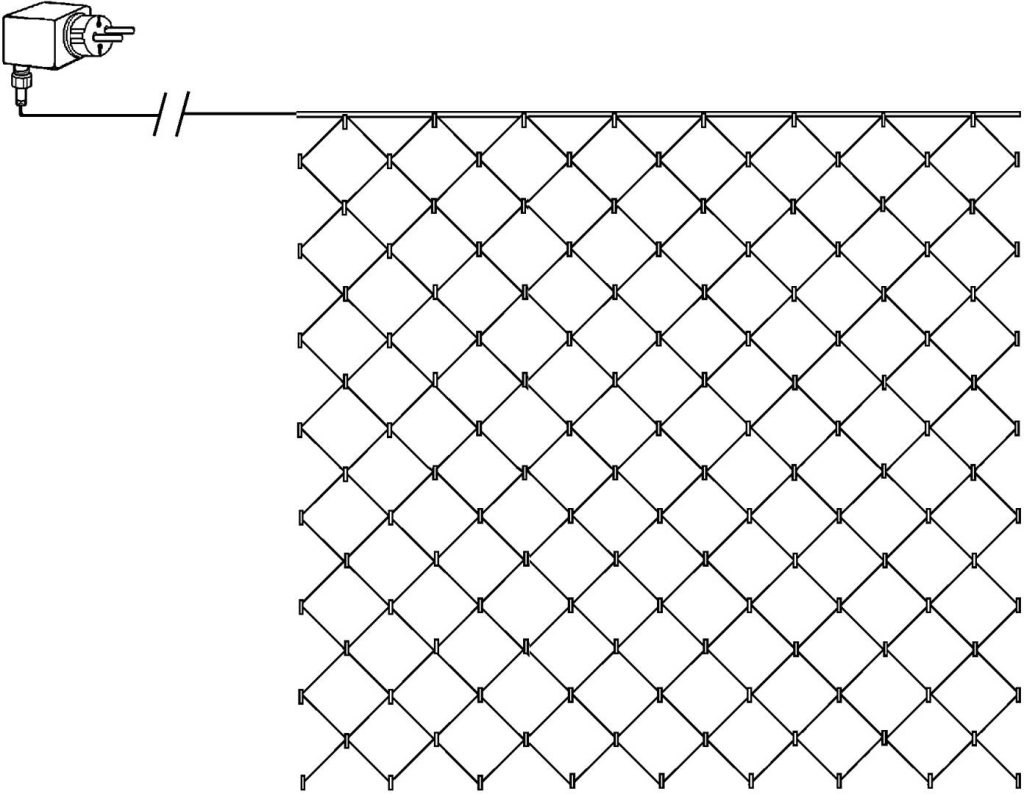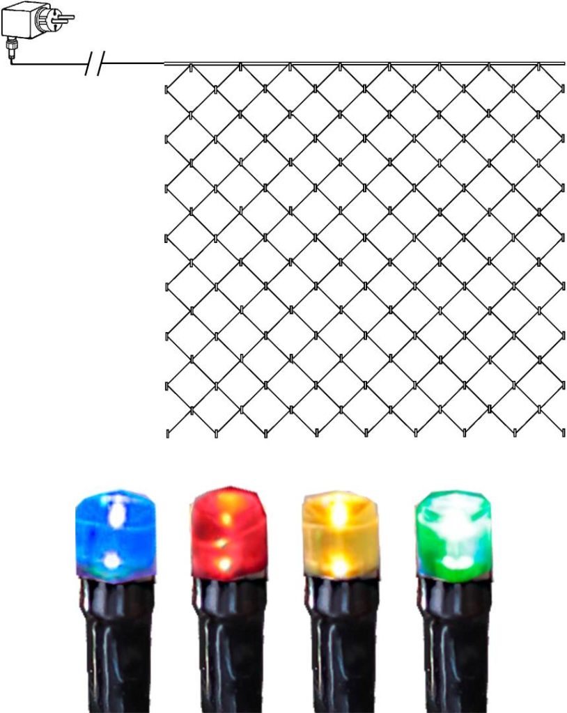 Ulkokäyttöön sopiva 3 metriä leveä ja 3 m korkea valoverkko, jossa on 180 moniväristä 5 mm LED-valopistettä. Kaapeli on väriltään musta.