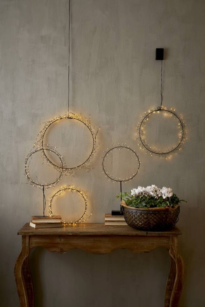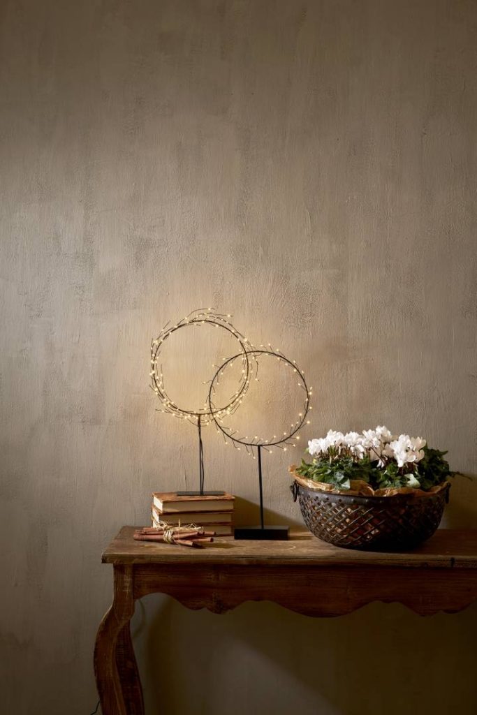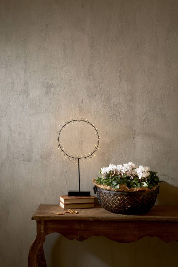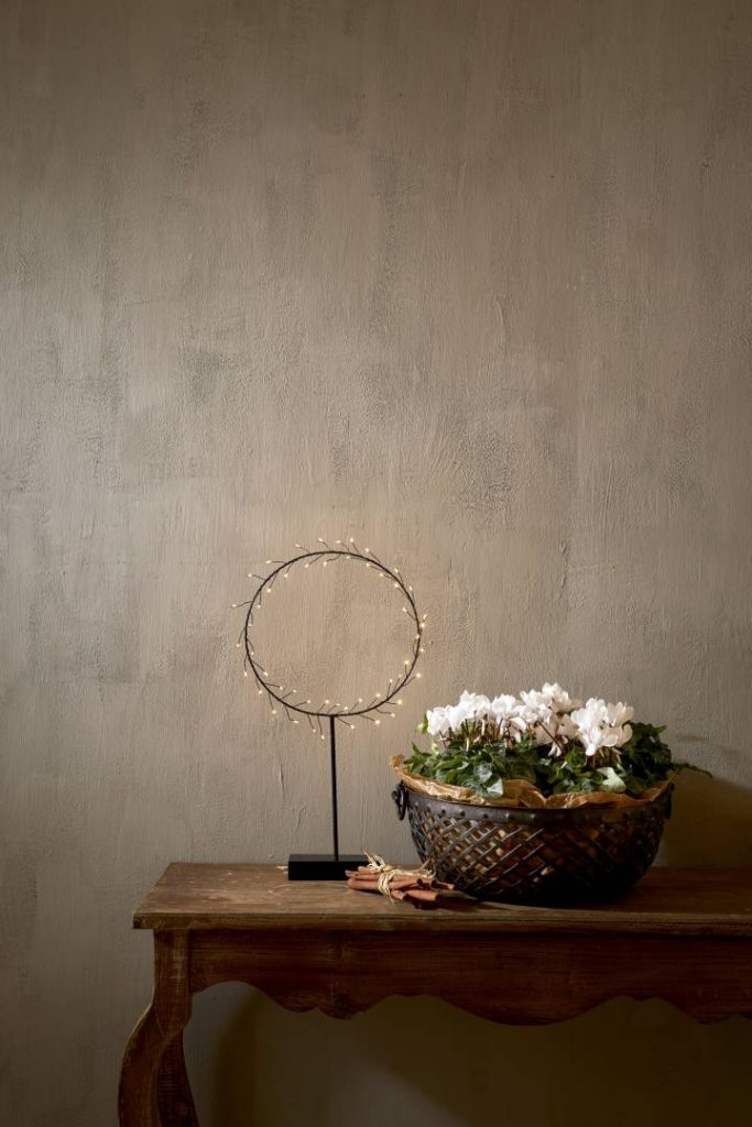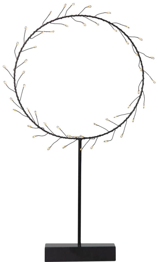 Mustaksi maalattu paristokäyttöinen metallikranssi, jonka 50 lämpimän valkoista LED-valopistettä luovat