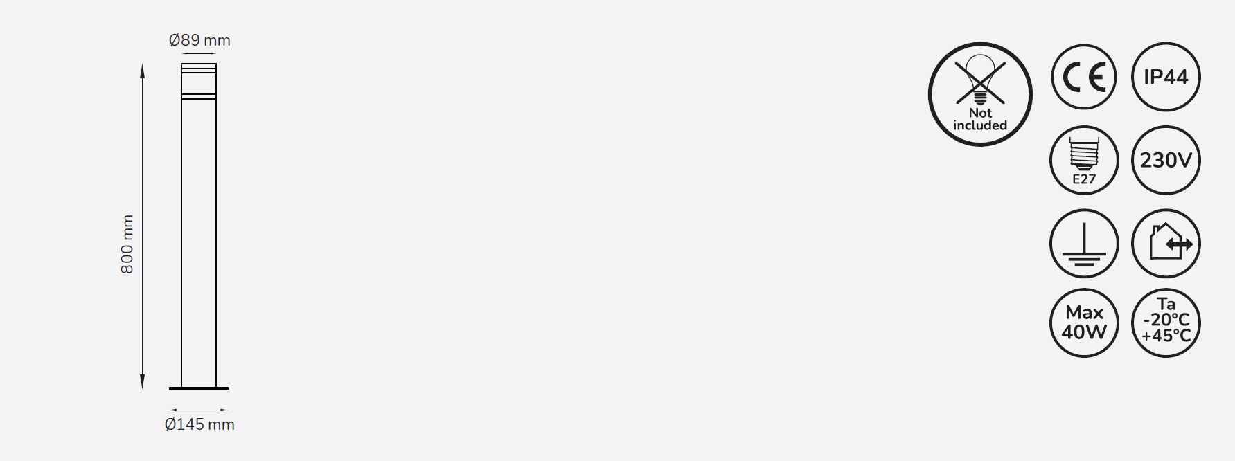 IP44. E27, max 40W. Ei sisällä valonlähdettä.