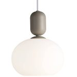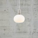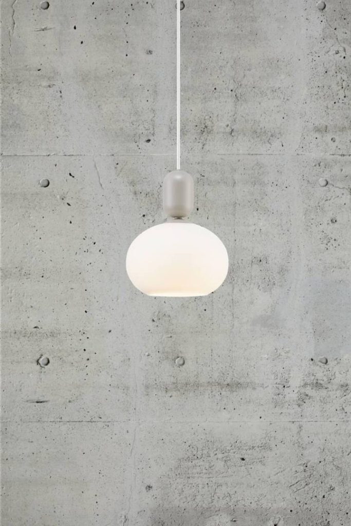 Suuri kupolimainen opaalivalkoinen lasivarjostin muodostaa mukavan kontrastin kevyen metallirungon kanssa, mikä lisää visuaalista volyymia ja pehmeää häikäisemätöntä valoa.