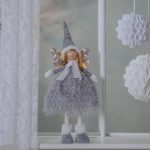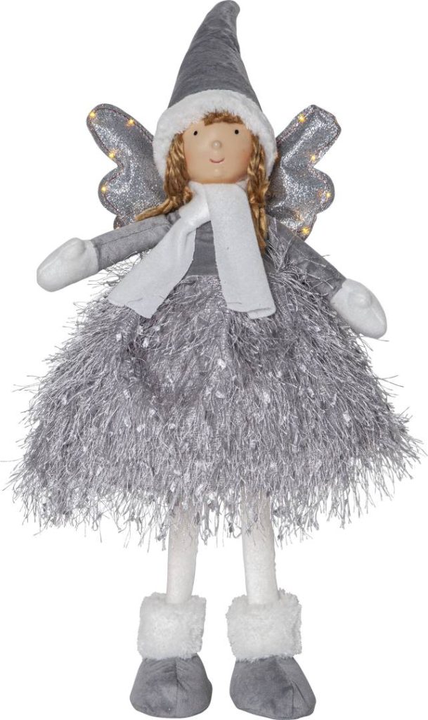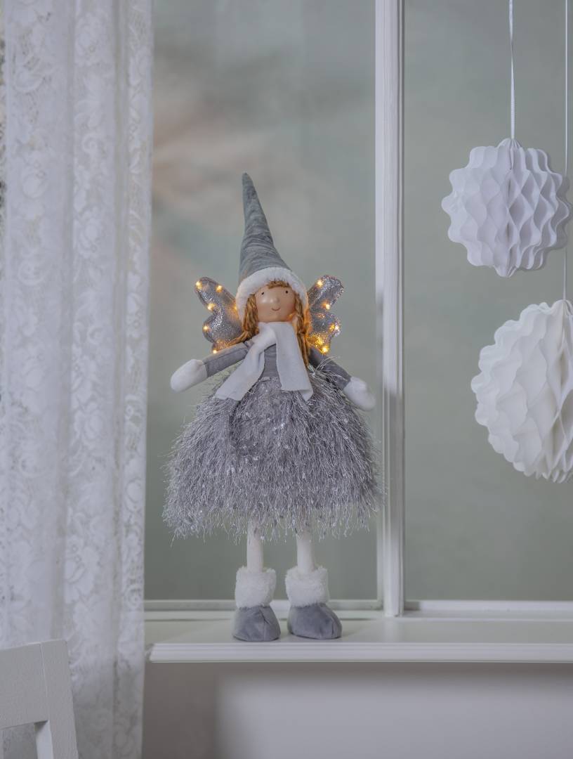Harmaaseen puettu koriste-enkeli, jonka siivissä loistaa 13 lämpimän valkoista pientä LED-valopistettä. Sopii esimerkiksi lastenhuoneeseen tai lipaston päälle jouluiseksi koristeeksi.