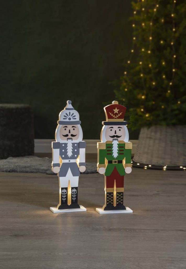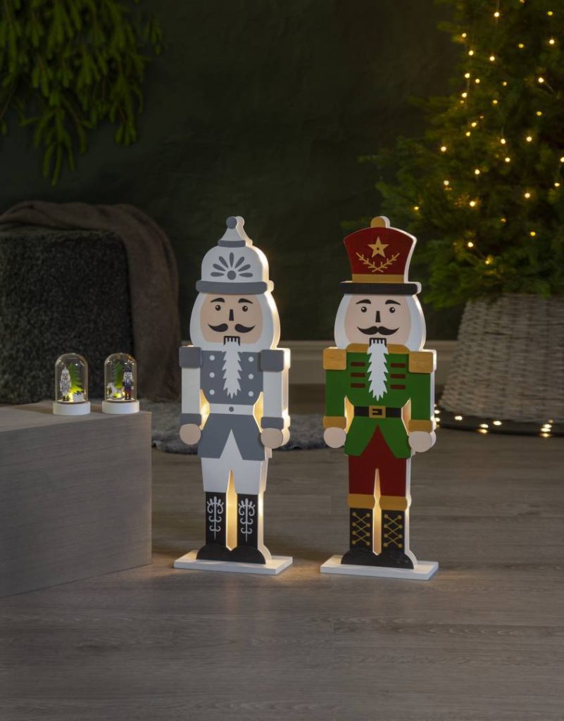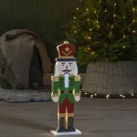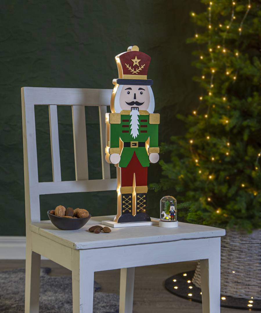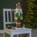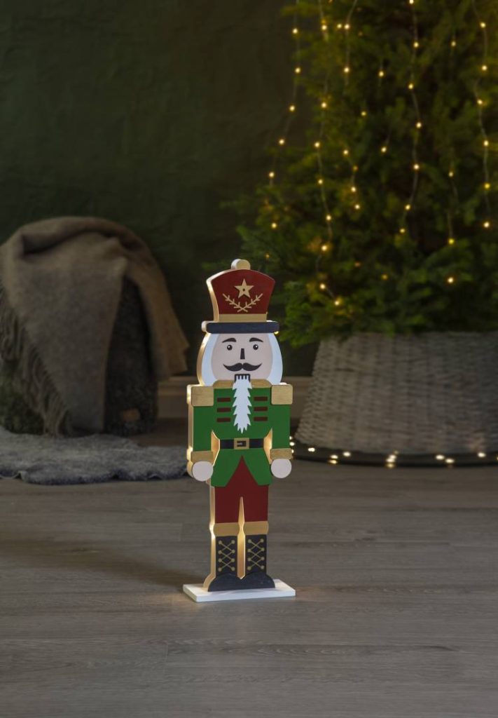 52 cm korkea Pähkinänsärkijä-hahmo vihreäksi, punaiseksi, mustaksi ja kullanväriseksi maalattua puuta. Sisäkäyttöön.