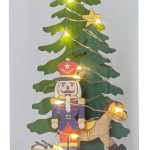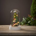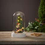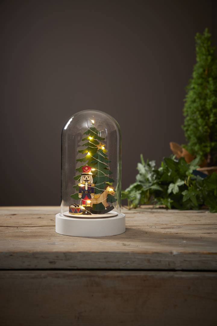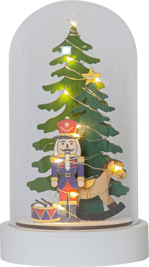 Pöytäkoriste, jossa lasikuvun sisällä on puinen Pähkinänsärkijä-hahmo, keinuhevonen, rumpu ja kaksi kuusta. Koristetta valaisee 10 LED-lamppua lämpimän valkoisella valolla. Sisäkäyttöön.